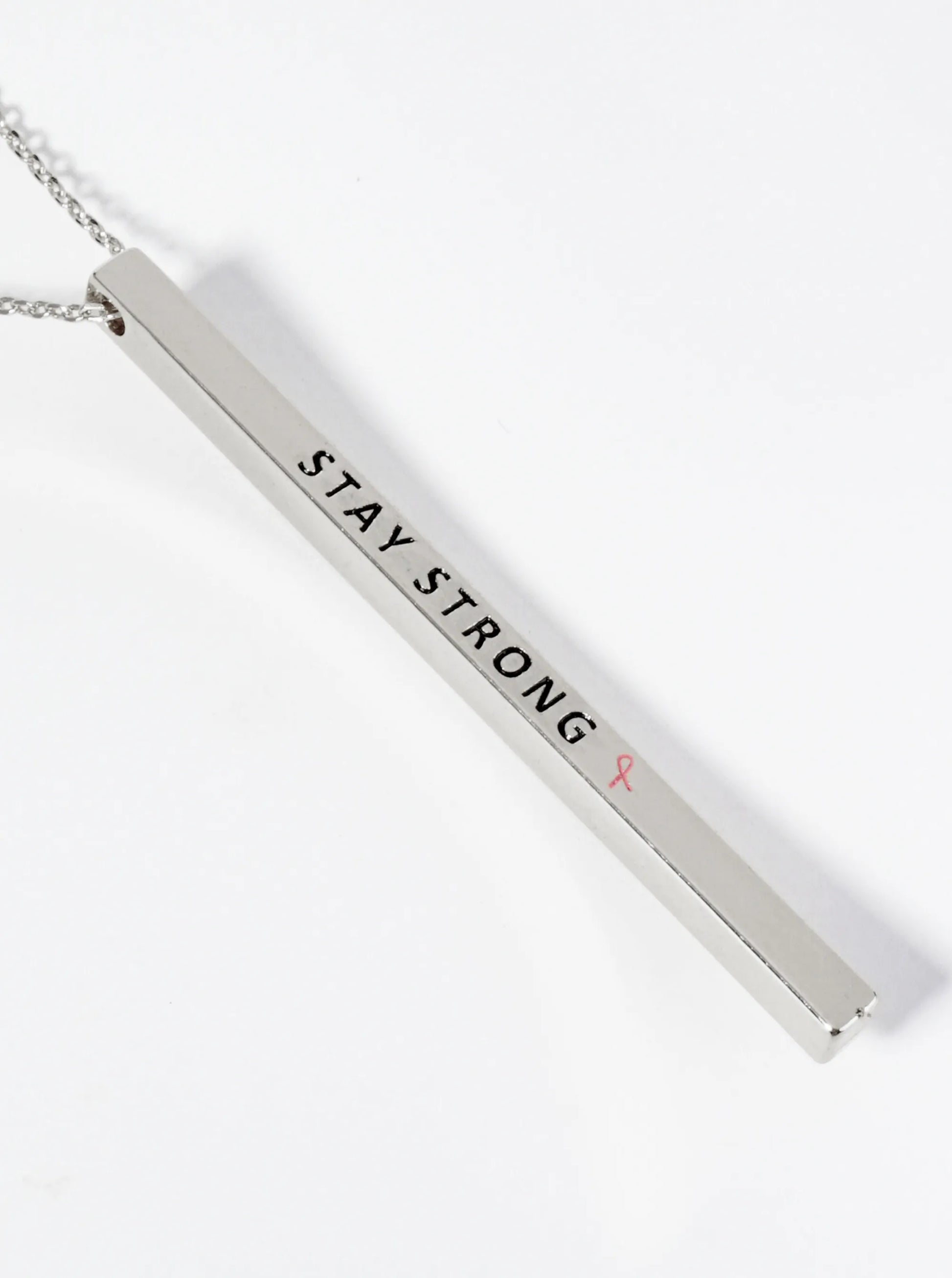 The Necklace Is A Powerful Symbol Of Resilience And Hope. This Sleek Vertical Bar Pendant Is Engraved With The Words "Stay Strong" Alongside The Iconic Pink Ribbon, A Universal Emblem Of Breast Cancer Awareness And Support. Crafted With A Polished Finish, The Pendant Radiates A Sense Of Elegance While Its Minimalist Design Ensures It Pairs Well With Any Outfit.