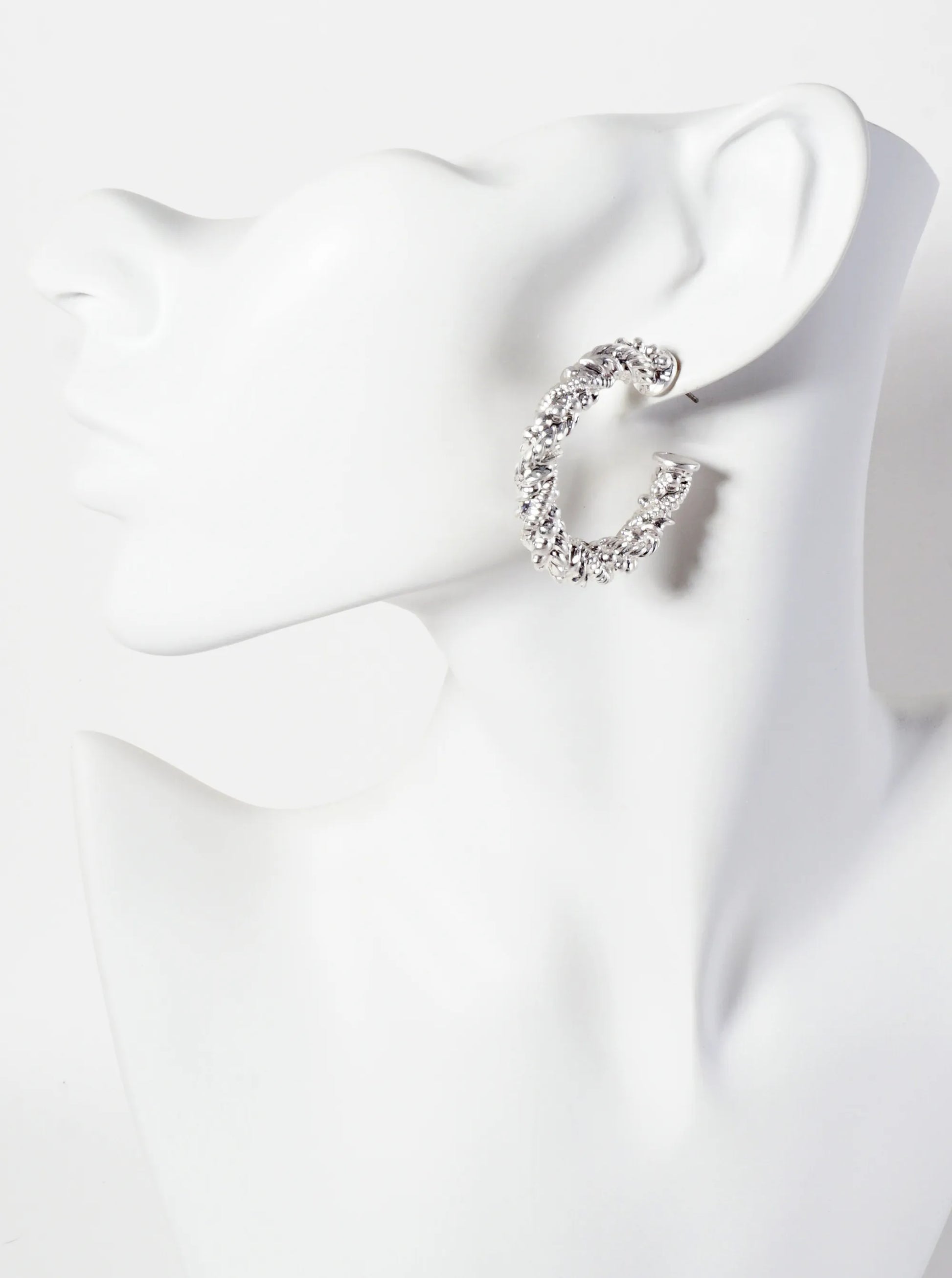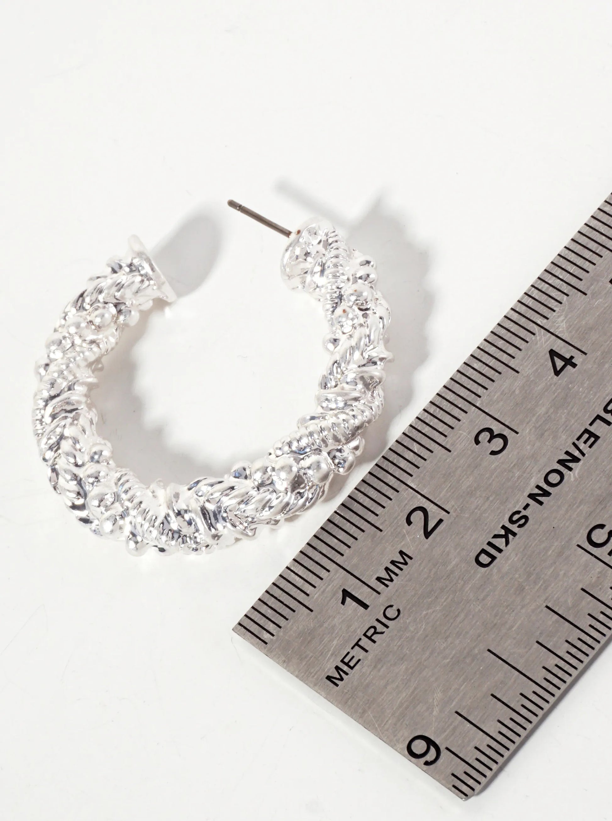 These Earrings Featuring A 35mm Open Hoop Design With An Intricate Textured Metal Finish That Adds Depth And Visual Interest. The Textured Surface Gives The Earrings A Modern, Dynamic Look, Combining Elegance With Subtle Sophistication. Secured With Titanium Posts, These Earrings Offer A Comfortable, Lightweight Fit, Making Them A Versatile Accessory That Pairs Well With Any Style Or Occasion.