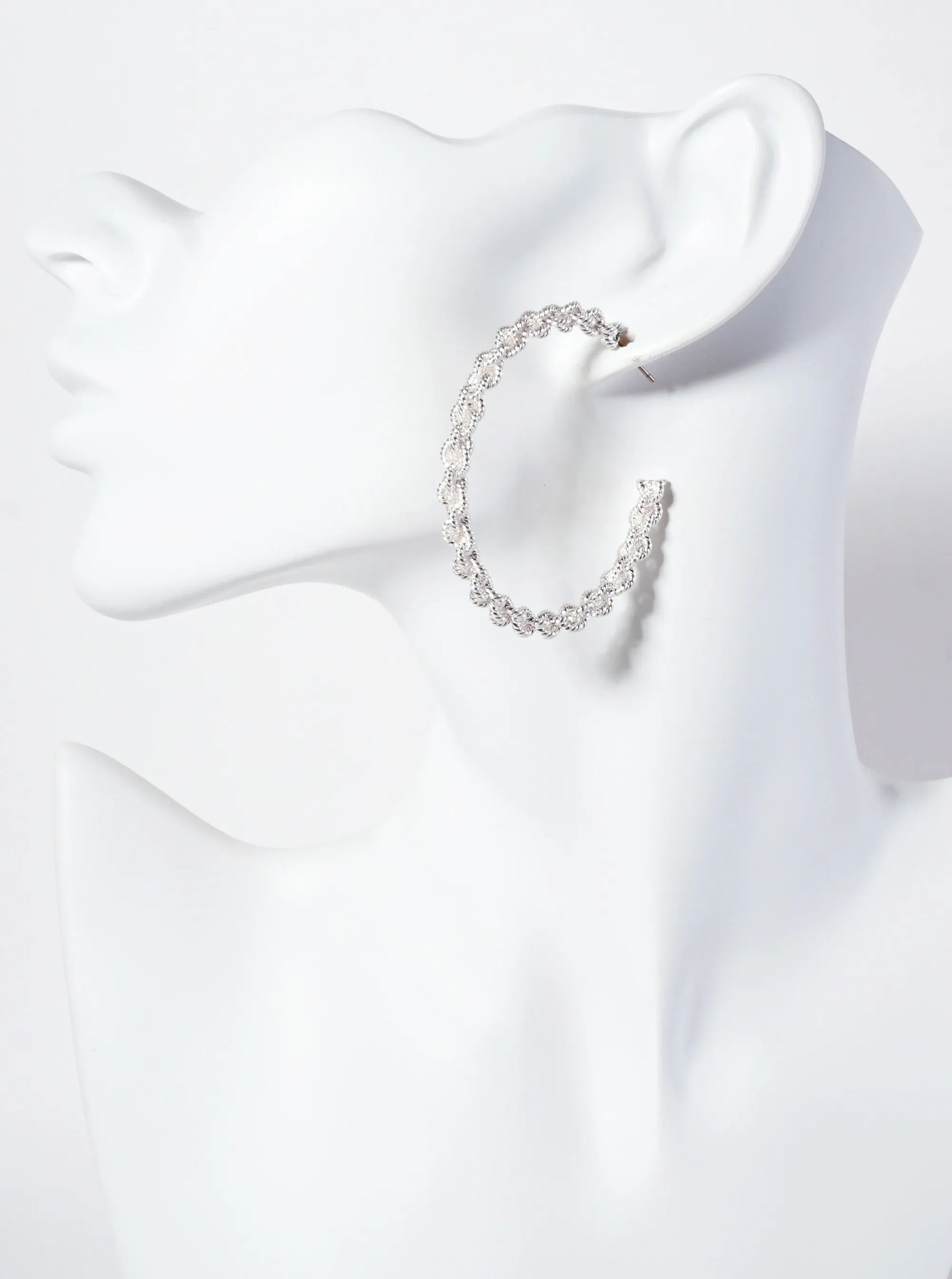 These Earrings Feature A Bold And Dynamic Design, Inspired By The Intricate Look Of Rope. These Earrings Are Crafted In A 55mm Open Hoop Shape, Offering A Statement Size That Makes Them Stand Out. The Surface Of The Hoops Is Beautifully Twisted, Creating A Rope-like Texture That Adds Depth And Visual Interest. The Textured Design Catches The Light With Every Movement, Giving The Earrings A Refined, Yet Rugged Appeal.