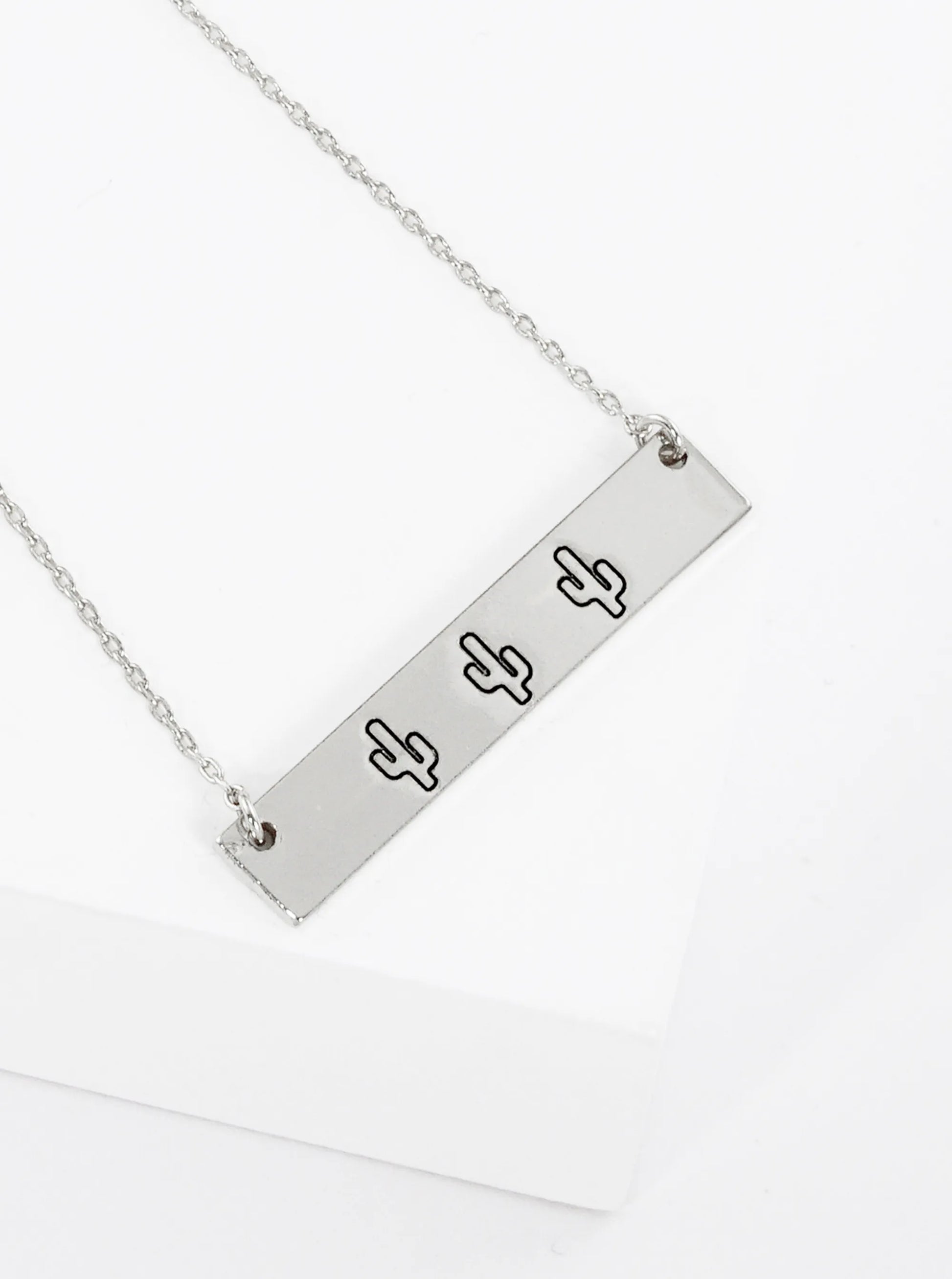 Three Cactus Engraved Horizontal Bar Pendant Necklace