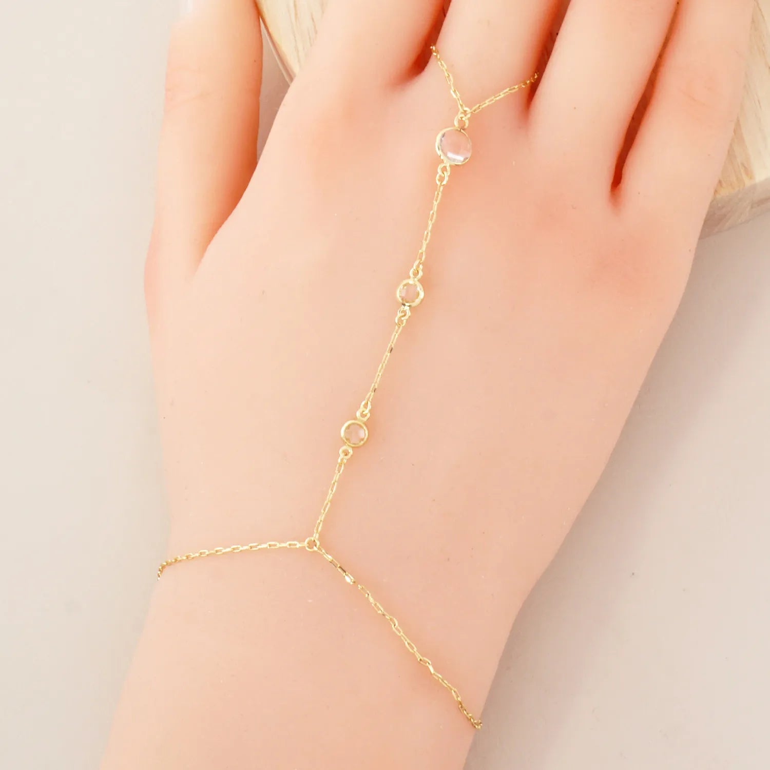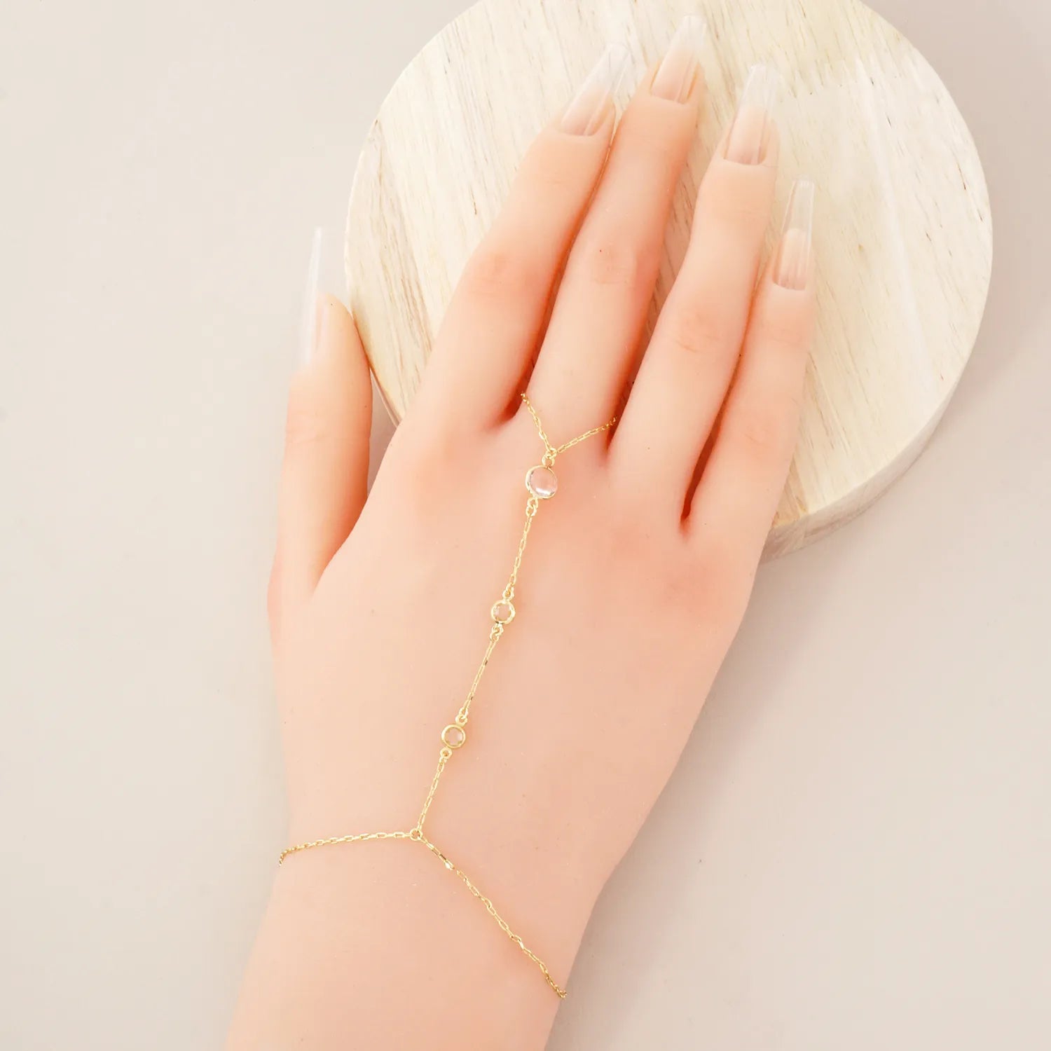 Three Faceted Round CZ Accent 18K-Gold-Dipped Delicate Brass Hand-Chain Bracelet