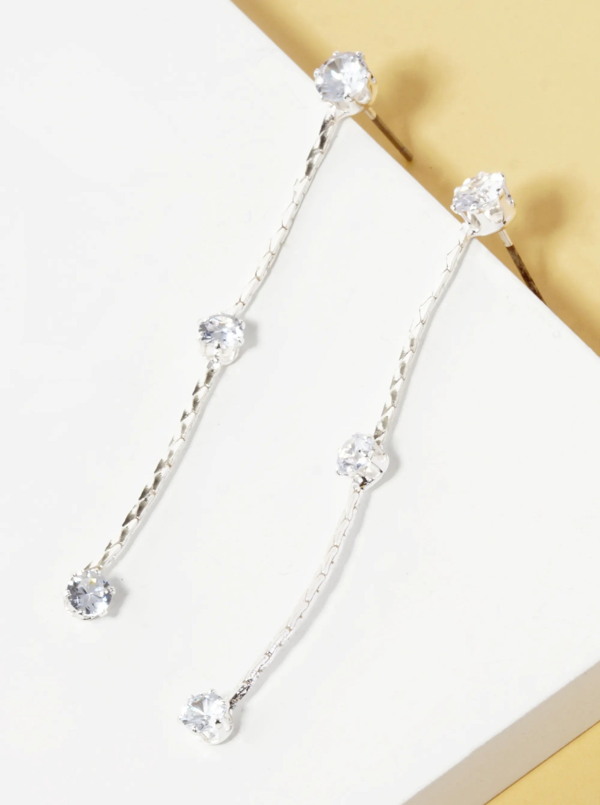Upgrade Your Jewelry Game With Our Three Graduated Stone Drop Station Chain Drop Earrings. Made With Sparkling Rhinestones And Brass, These Earrings Come In A Variety Of Eye-catching Colors Like Gold And Silver. The Perfect Combination Of Textures And Plating Colors For A Glamorous And Versatile Addition To Your Collection.