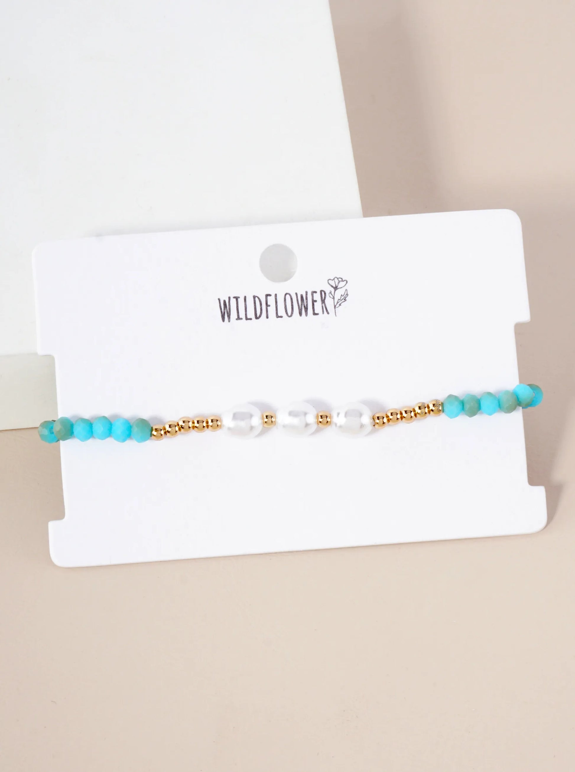 Three Pearl-Bead Accents Faceted-Glass-Beaded Stretch Bracelet