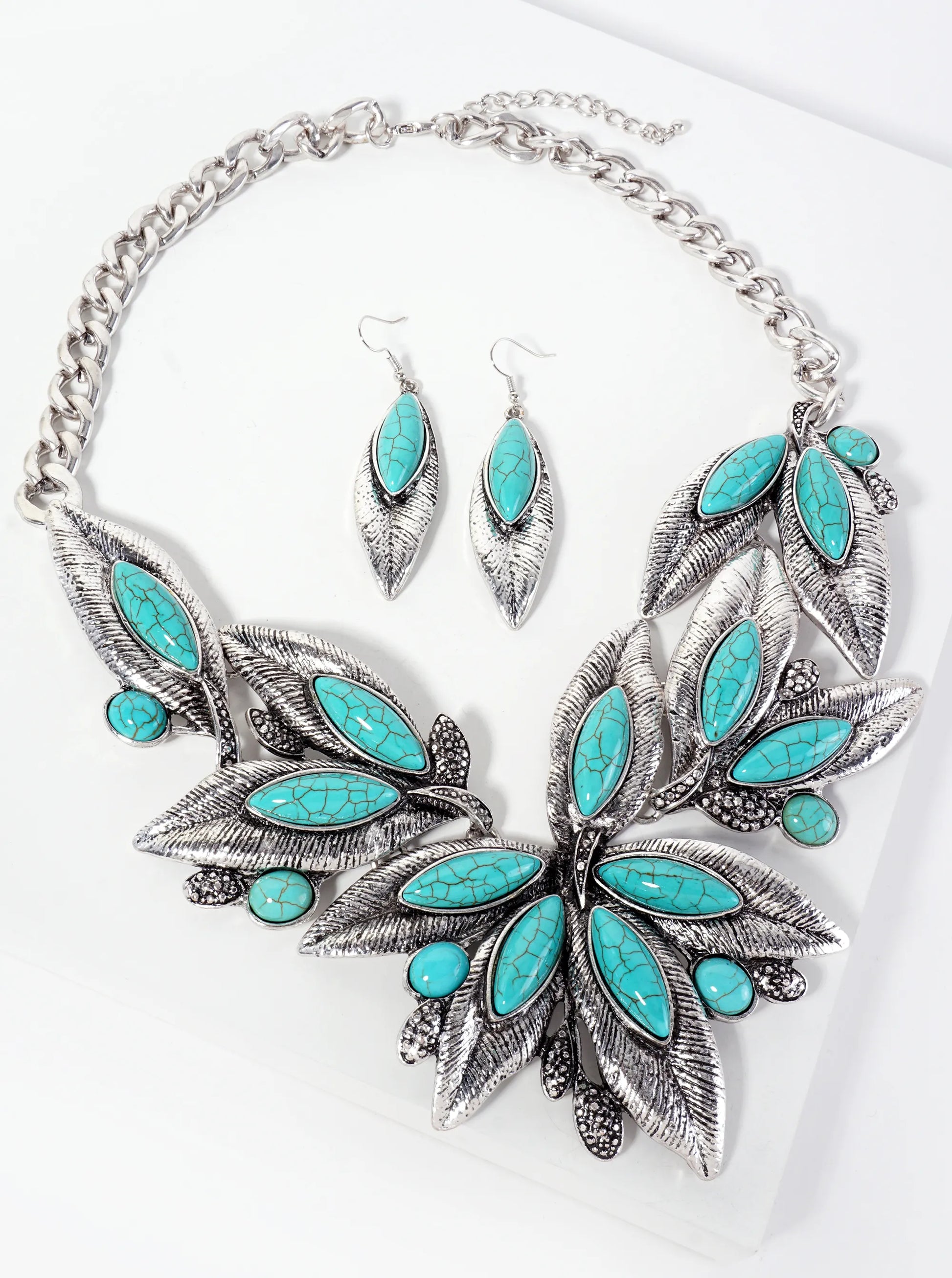 The Necklace Is A Striking And Vibrant Jewelry Set That Beautifully Combines Earthy Bohemian Aesthetics With Rugged Western Charm. The Necklace Features Turquoise Semi-precious Stones, Known For Their Rich Blue-green Hues That Evoke The Natural Beauty Of The Southwestern Landscape. These Stones Are Artfully Arranged In A Bib-style Design, Creating A Bold, Statement-making Silhouette That Gracefully Drapes Across The Neckline.