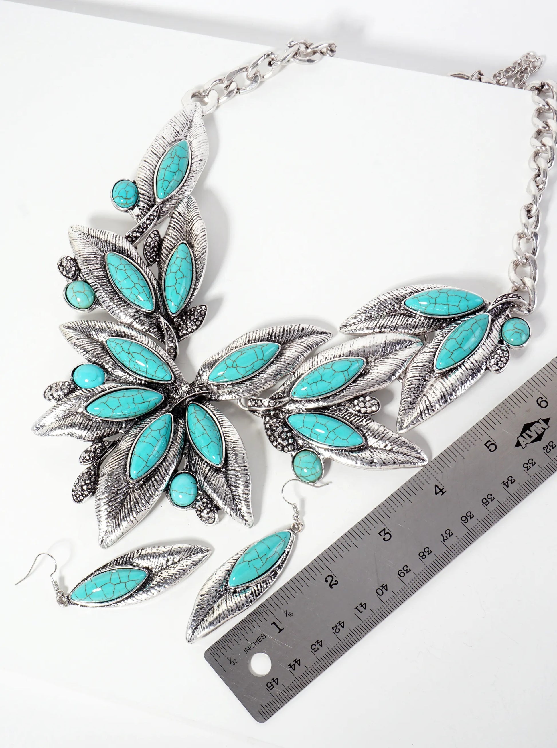 Turquoise Semi-Precious Natural-Stone Bohemian Western Bib Statement Necklace Set-with-Earrings