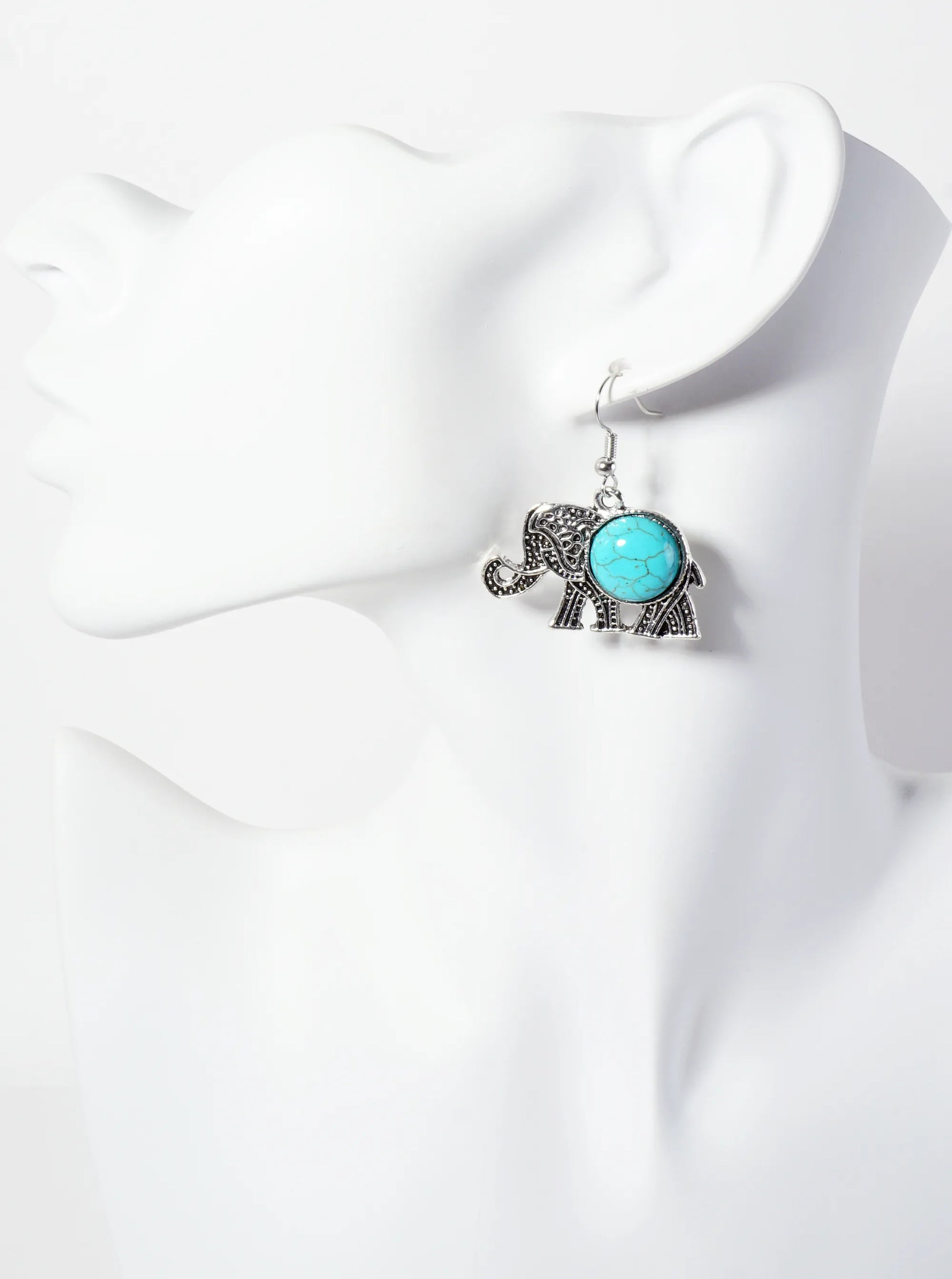 The Earrings Are A Striking Blend Of Nature And Artistry. Featuring Intricate Elephant Designs, These Earrings Are Adorned With Vibrant Turquoise Stones, Adding A Pop Of Color And Natural Beauty. The Textured Detailing On The Elephants Enhances The Design, Giving Them A Handcrafted, Organic Feel. The Drop Style Adds An Elegant Touch, Allowing The Earrings To Sway Gracefully With Movement. Perfect For Those Who Appreciate Unique, Nature-inspired Jewelry, These Earrings Are A Bold Statement Piece That Combines Charm, Symbolism, And Craftsmanship.