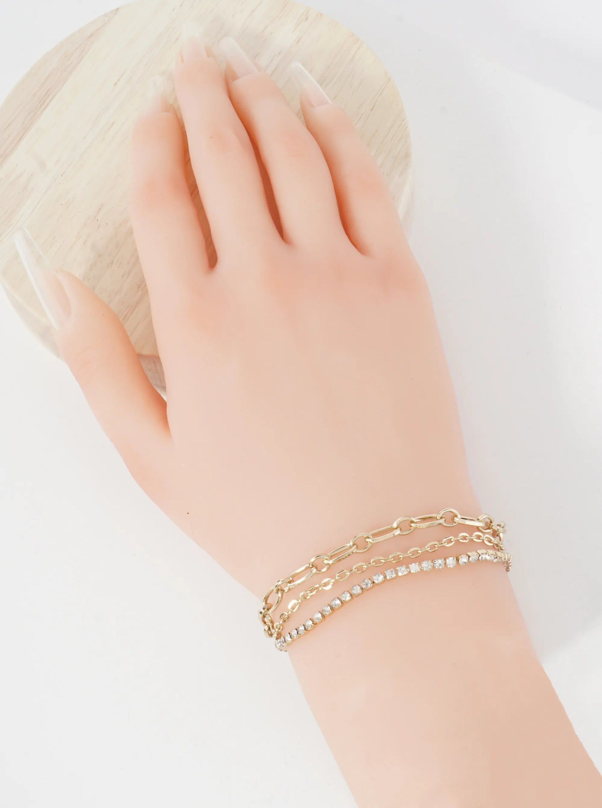 This Elegant Bracelet Features Two Delicate Chains Intertwined With A Shimmering Rhinestone Strand, Adding A Touch Of Sparkle To The Design. The Toggle Closure Ensures A Secure Fit While Providing A Stylish Focal Point. Perfect For Adding A Chic, Refined Touch To Both Casual And Formal Outfits.
