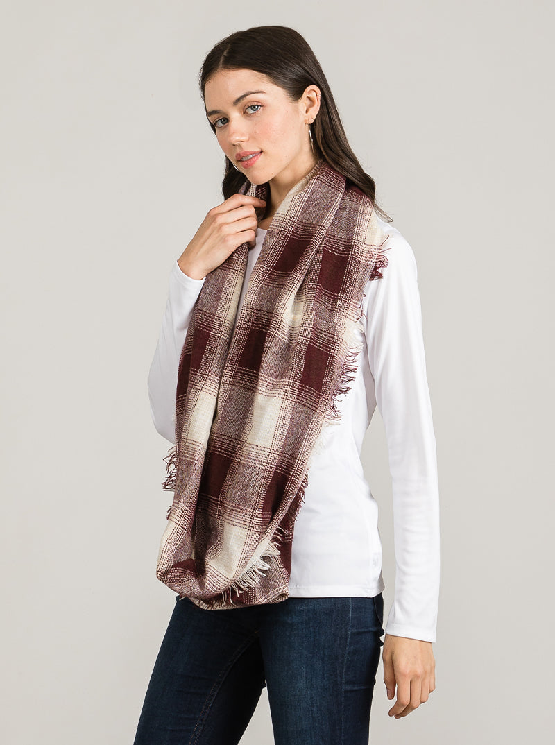 Two-Tone Checkered Plaid Double Loop Infinity Scarf With Fringe