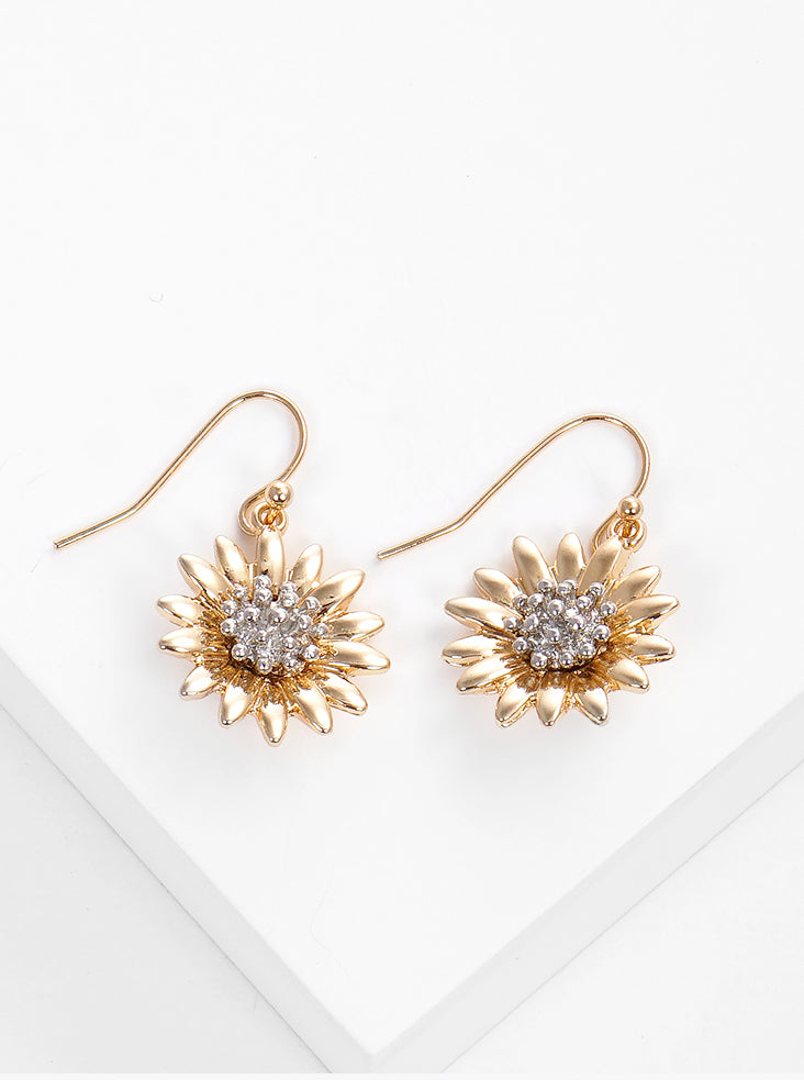 Two Tone Metal Floral Flower Dangle Drop Earrings