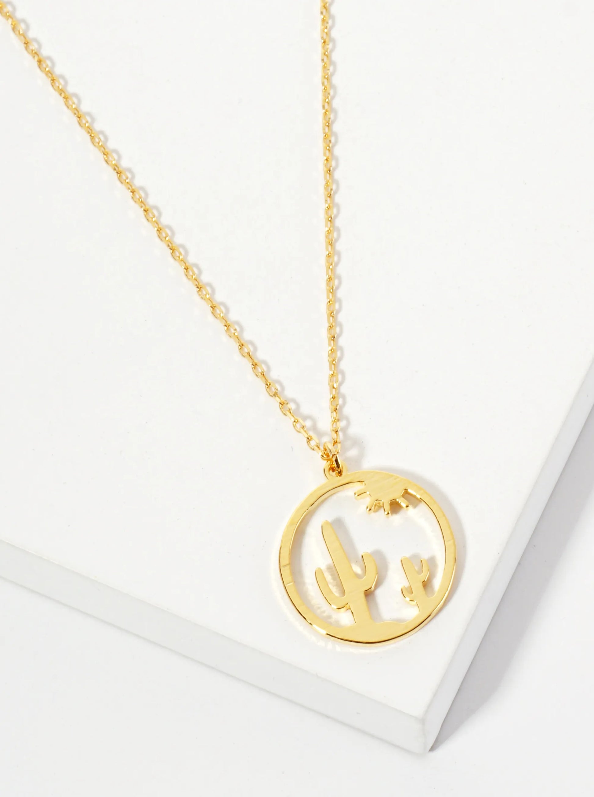 The Necklace Is A Bold And Striking Piece That Combines Southwestern Charm With Contemporary Elegance. The Pendant Features A Cut-out Cactus Design Set Within A Circular Frame, Capturing The Essence Of The Desert Landscape And Western Aesthetic. The Brushed Texture Of The Pendant Gives It A Matte, Rustic Finish, Adding Depth And Character To The Design. Dipped In 18K Gold, The Pendant Radiates A Subtle, Luxurious Glow While Maintaining A Grounded, Earthy Feel. Suspended From A Delicate Gold Chain, This Necklace Offers A Unique Fusion Of Nature-inspired Beauty And Western Flair, Making It An Ideal Statement Piece For Those Who Appreciate Both Style And Symbolism. Perfect For Adding A Touch Of Adventure To Any Outfit.