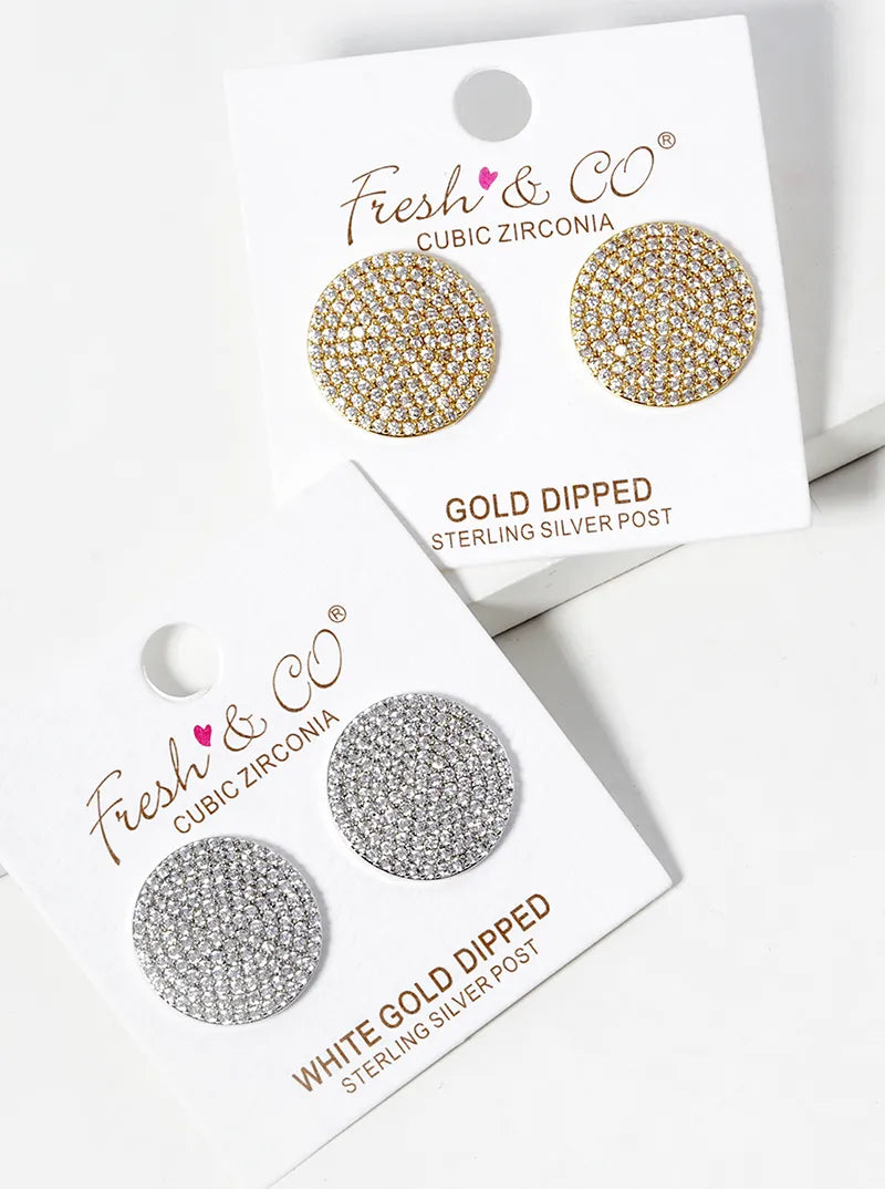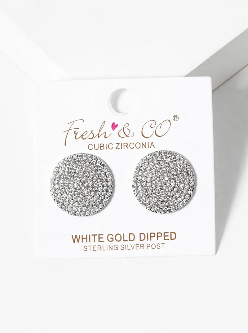 White Gold Dipped 15mm CZ Pave Round Statement Post Stud Earrings