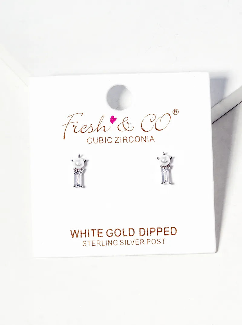 White Gold Dipped Baguette CZ And Pearl Post Stud Earrings