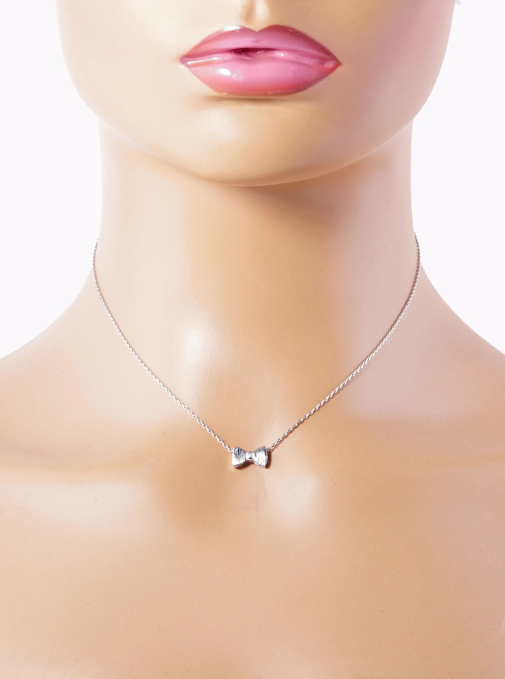 White Gold Dipped Brushed Metal Ribbon Bow Pendant Necklace