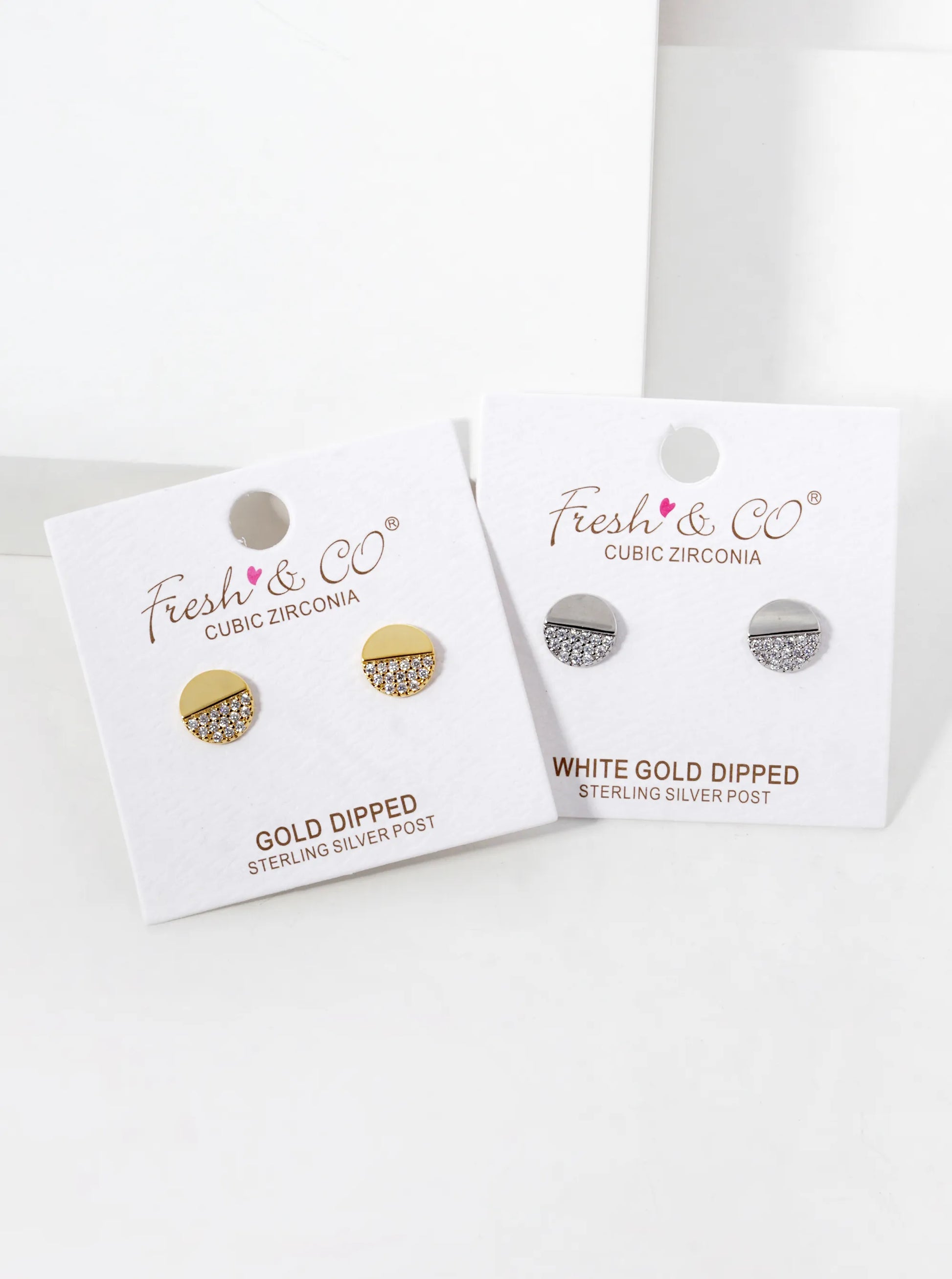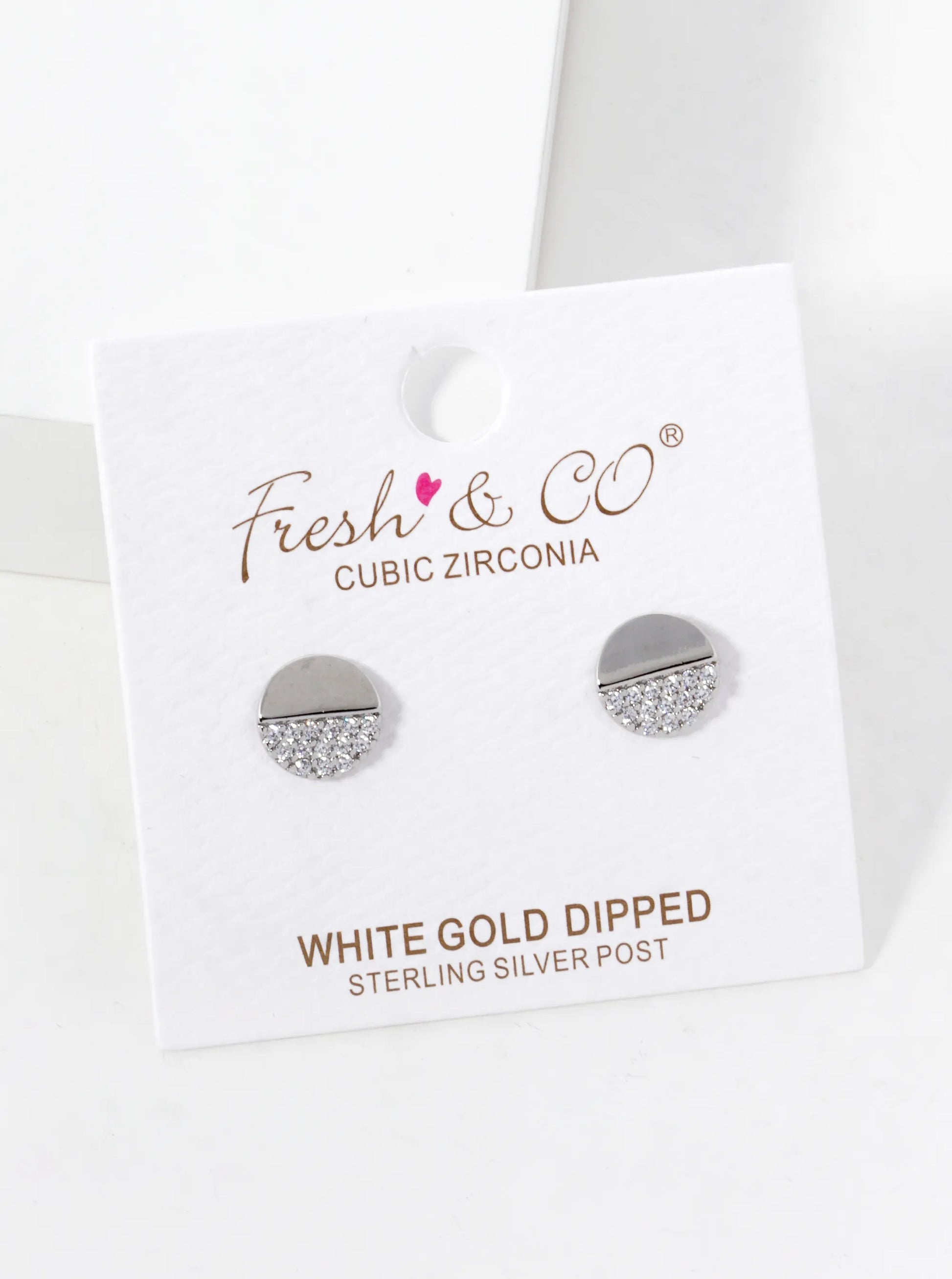 White Gold Dipped CZ Pave 8mm Round Stud Earrings