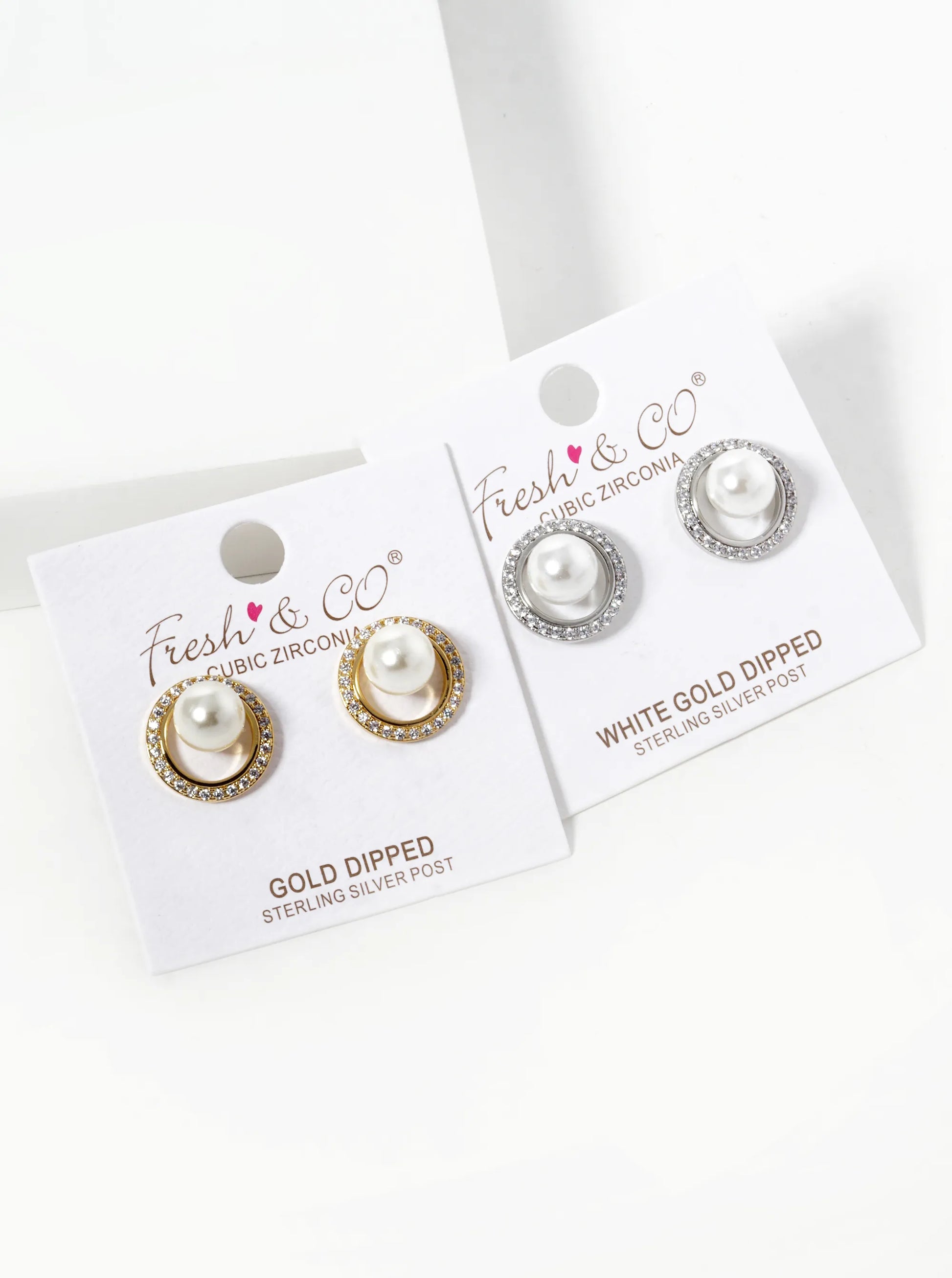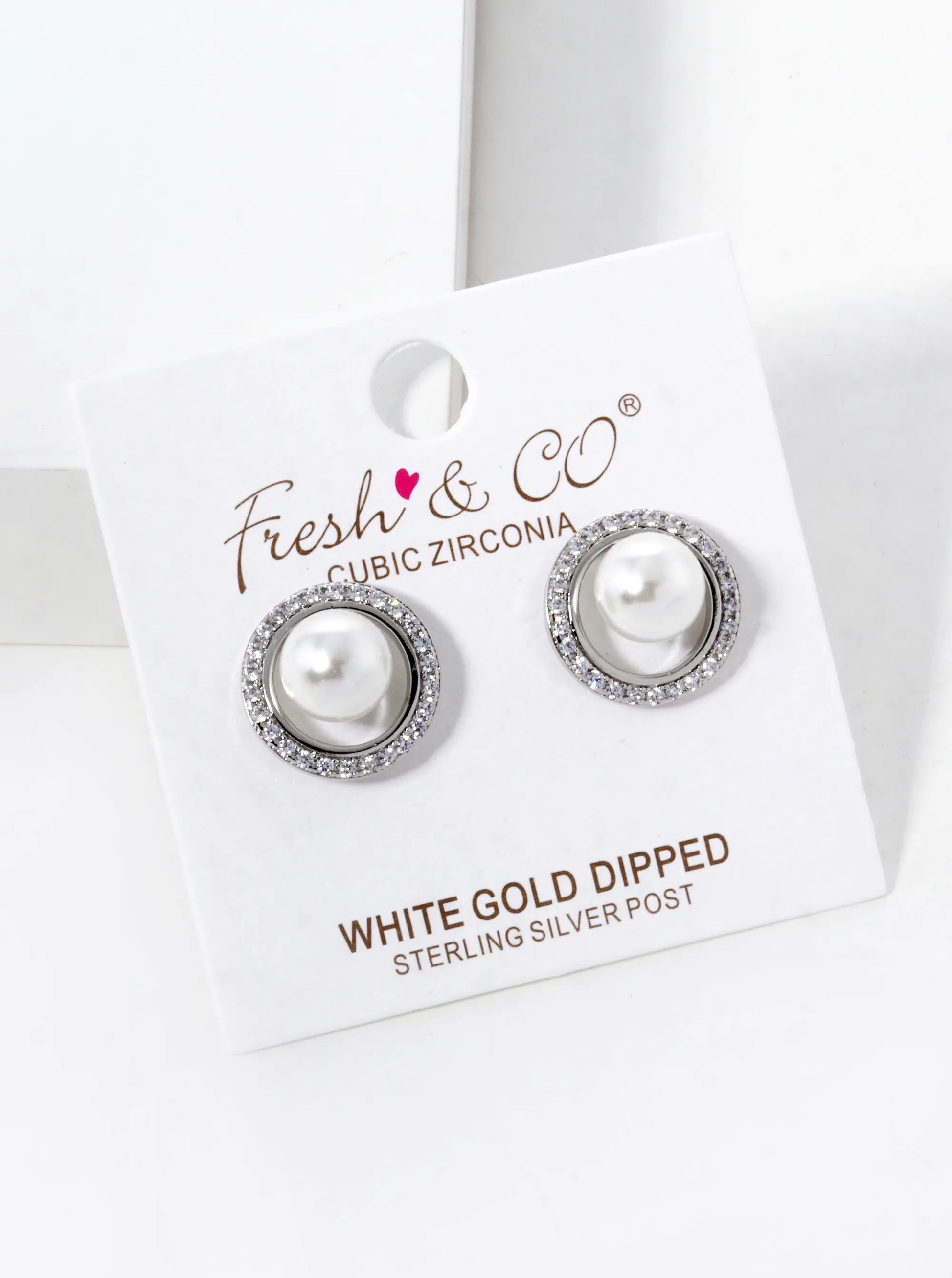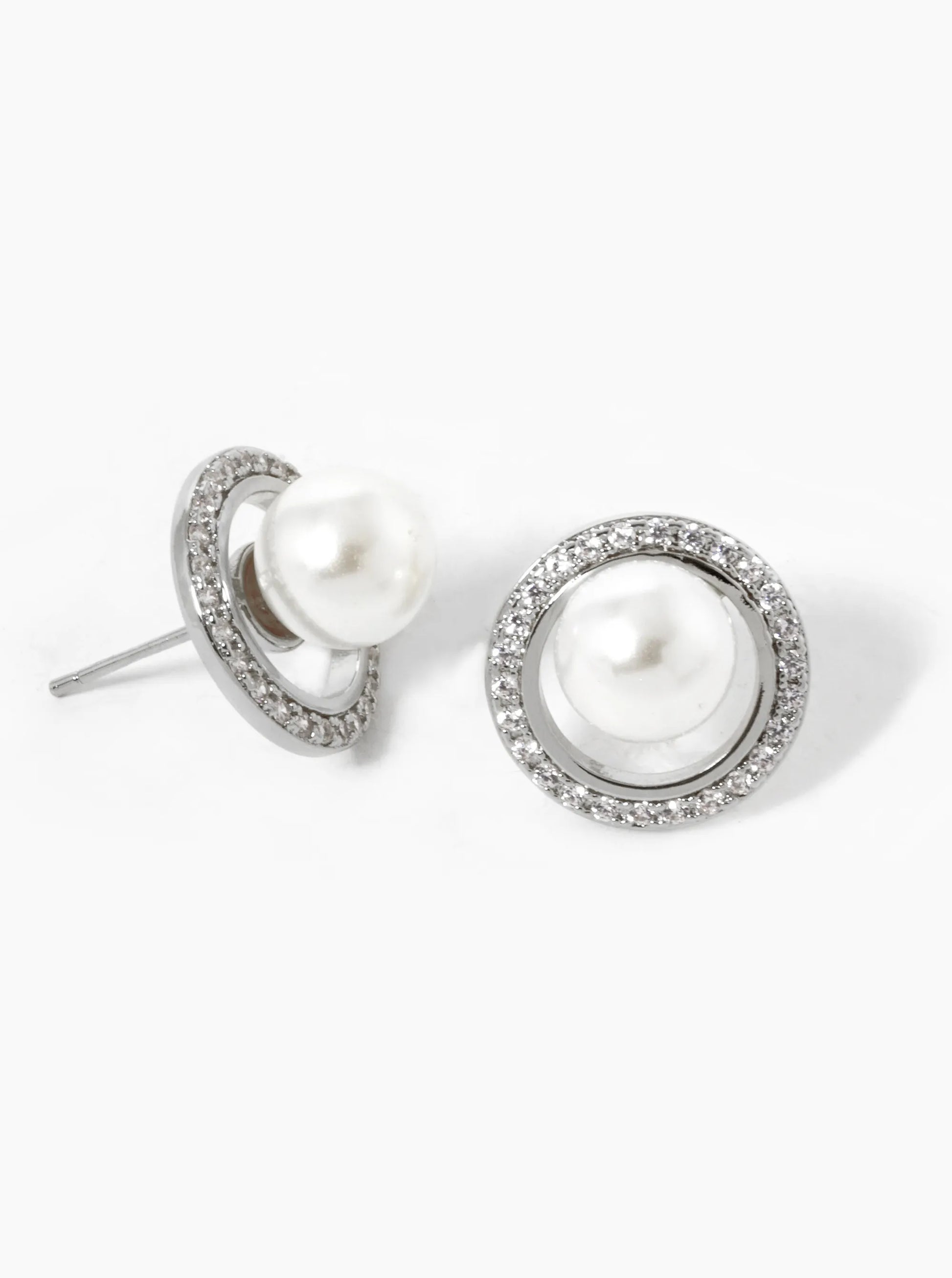 White Gold Dipped CZ Pave Circle With Pearl Stud Earrings