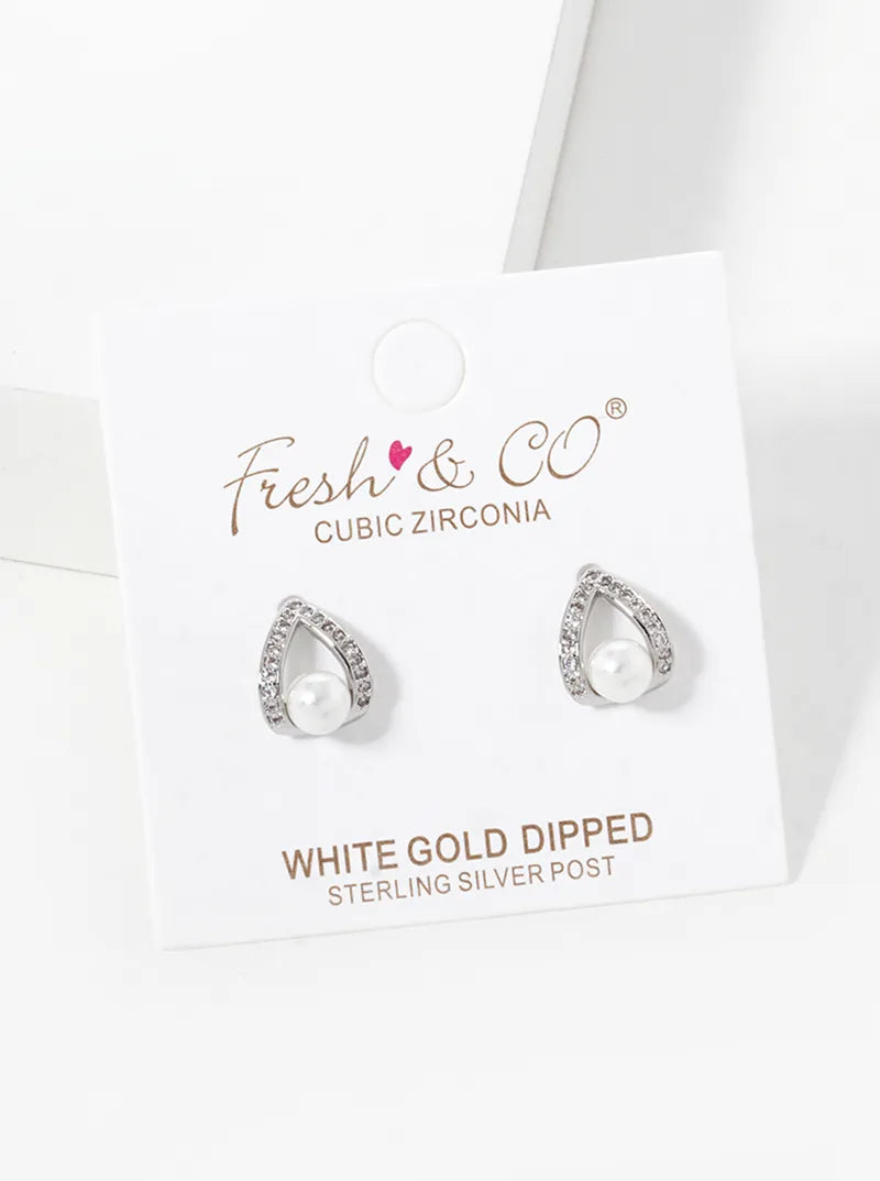White Gold Dipped CZ Pave Curved Teardrop Stud Earrings