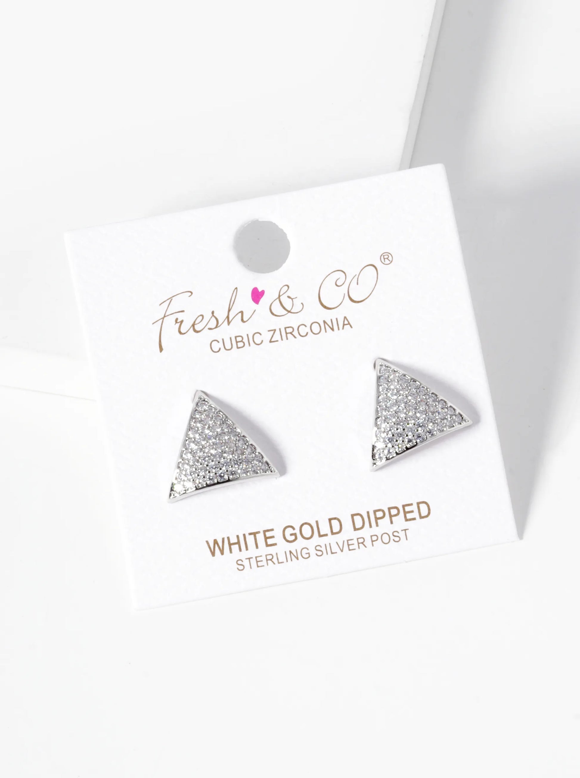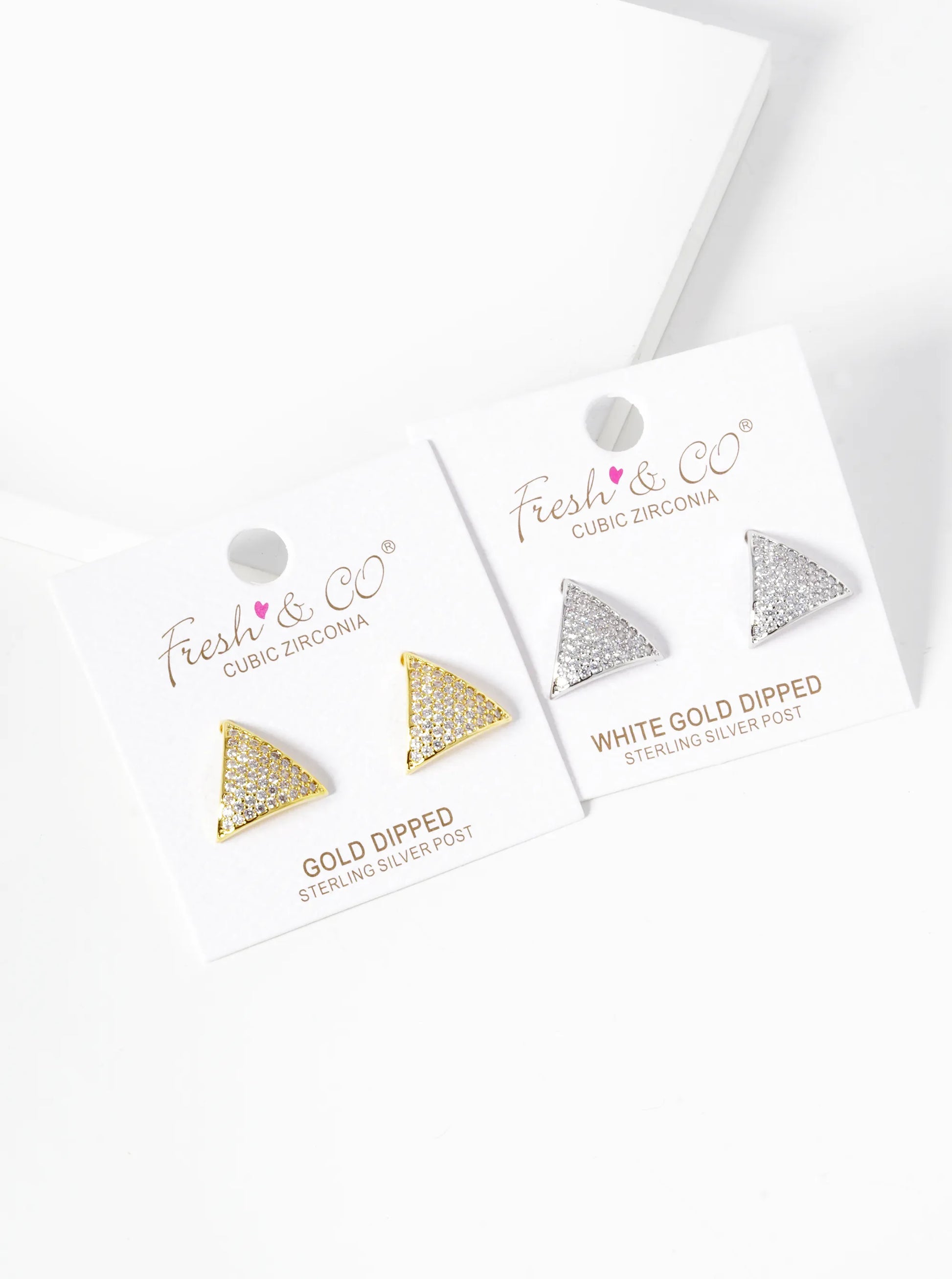 White Gold Dipped CZ Pave Curved Triangle Stud Earrings