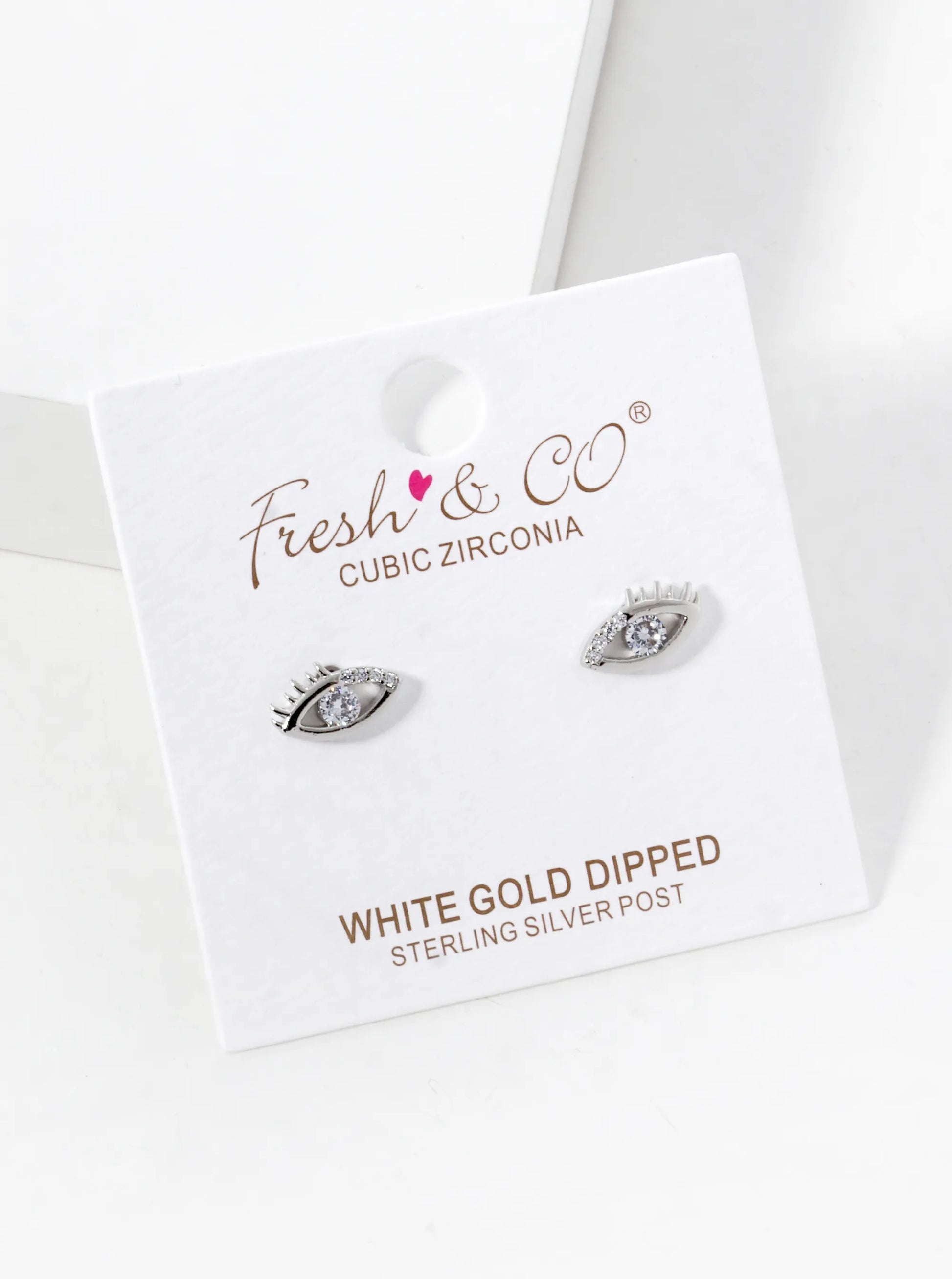 White Gold Dipped CZ Pave Dainty Evil Eye Stud Earrings