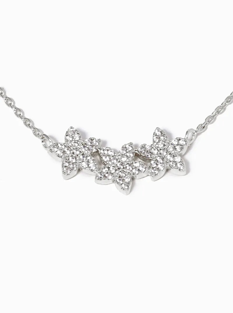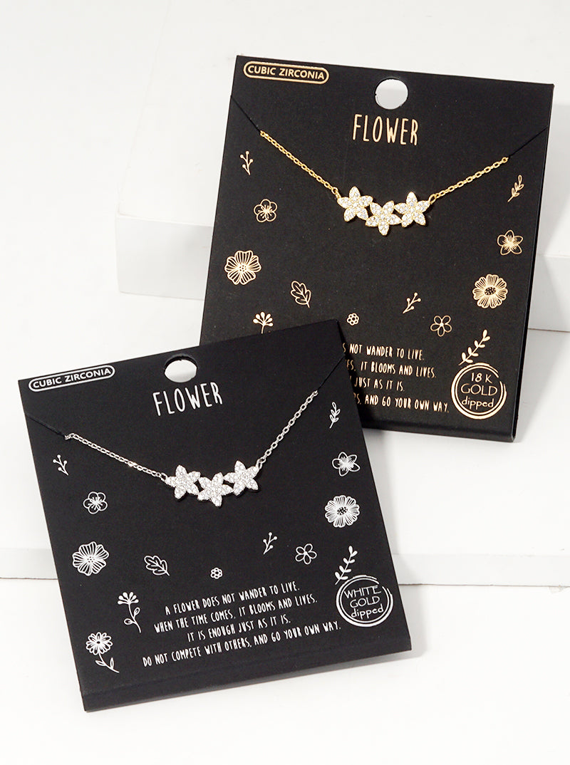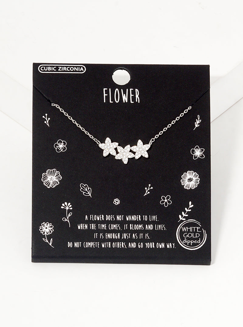 White Gold Dipped CZ Pave Dainty Three Flower Pendant Necklace