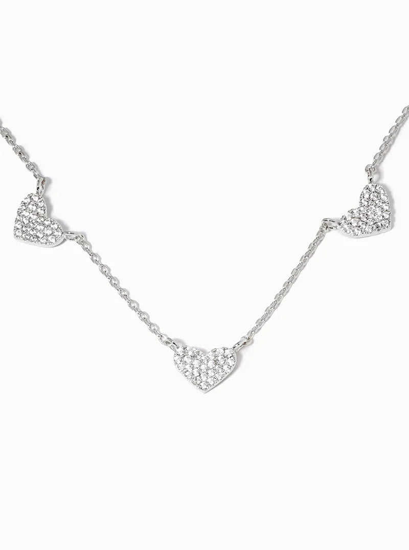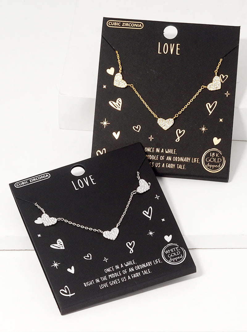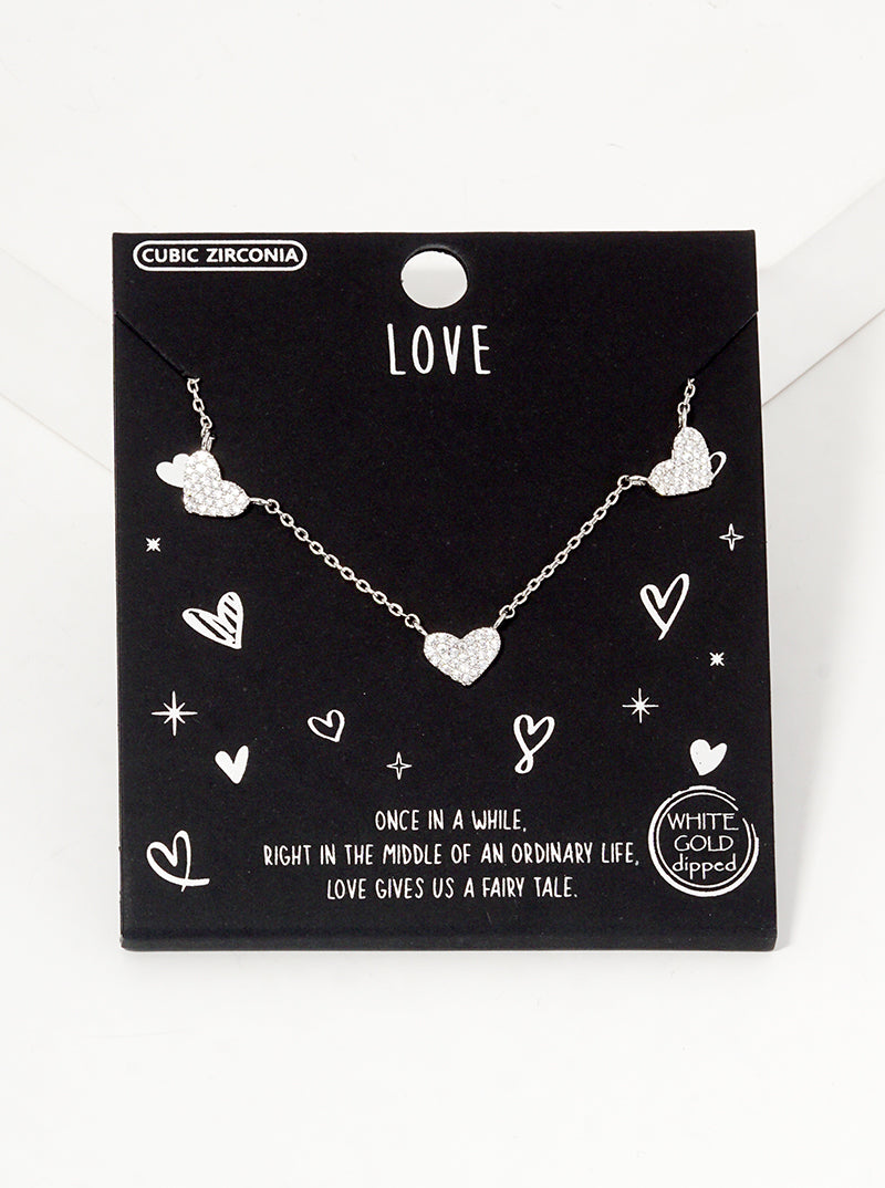 White Gold Dipped CZ Pave Dainty Three Hearts Pendant Necklace