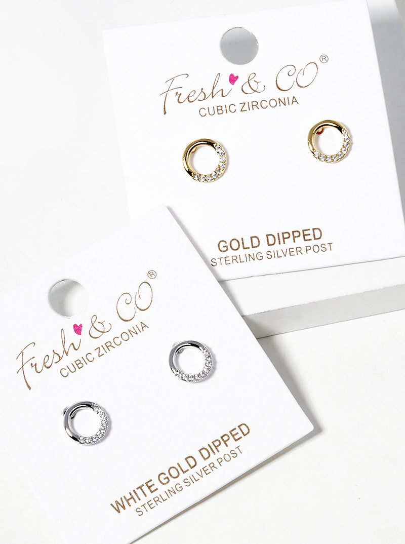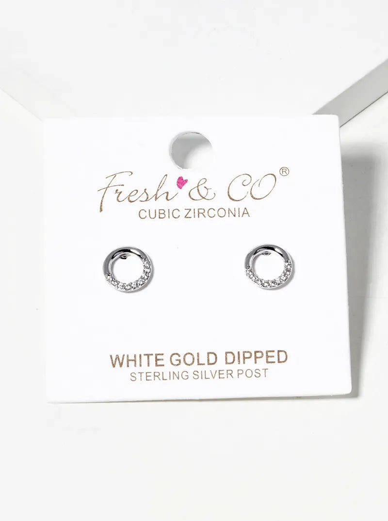 White Gold Dipped CZ Pave Delicate Circle Post Stud Earrings
