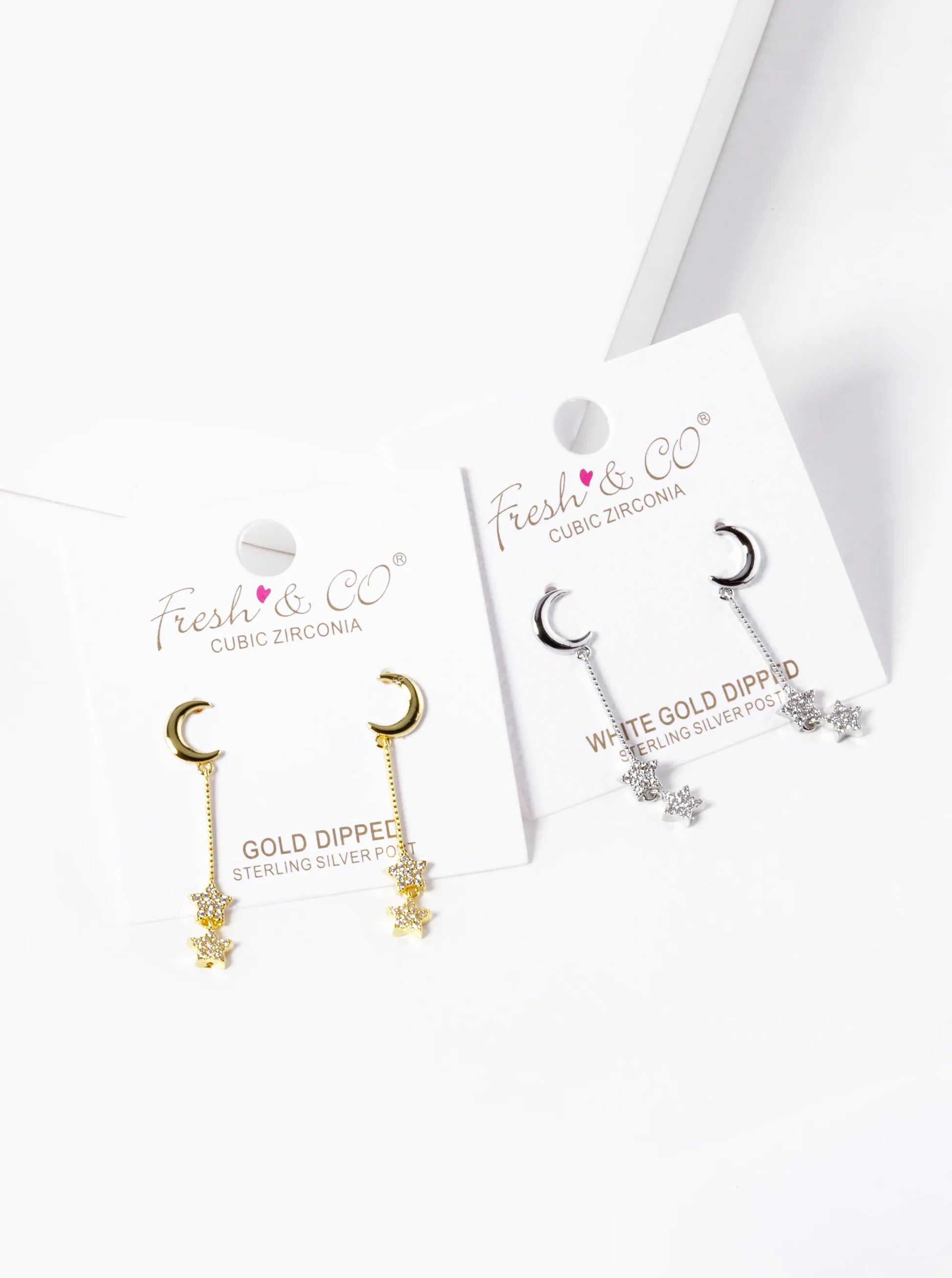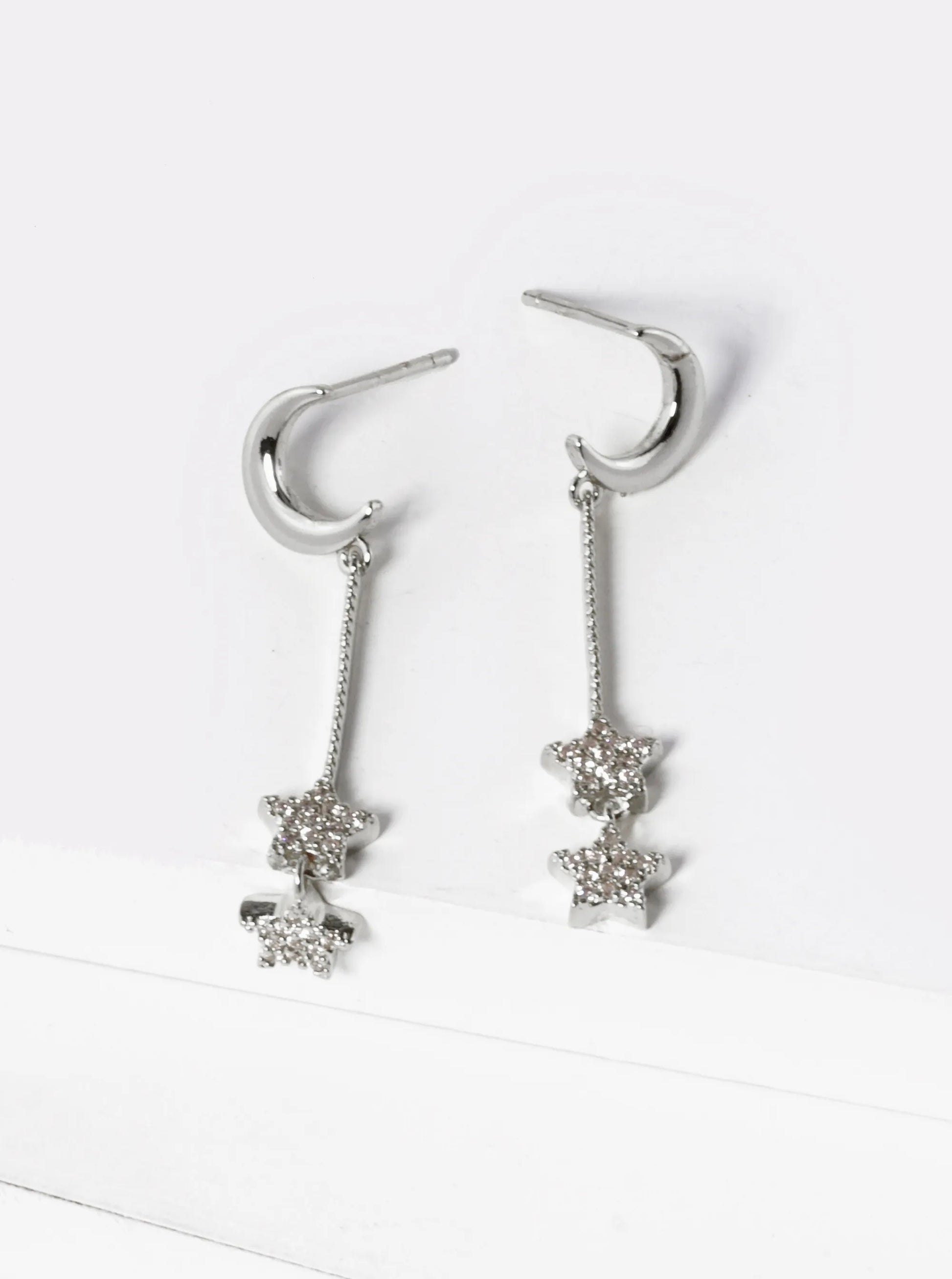 These Stunning 18k Gold Dipped Earrings Featuring A Double Star Drop And CZ Pave Crescent Moon Makes A Perfect Addition To Any Season. With Its Delicate Metal Texture And Lustrous Colors, It's Sure To Become A Fast Bestseller In Your Store!