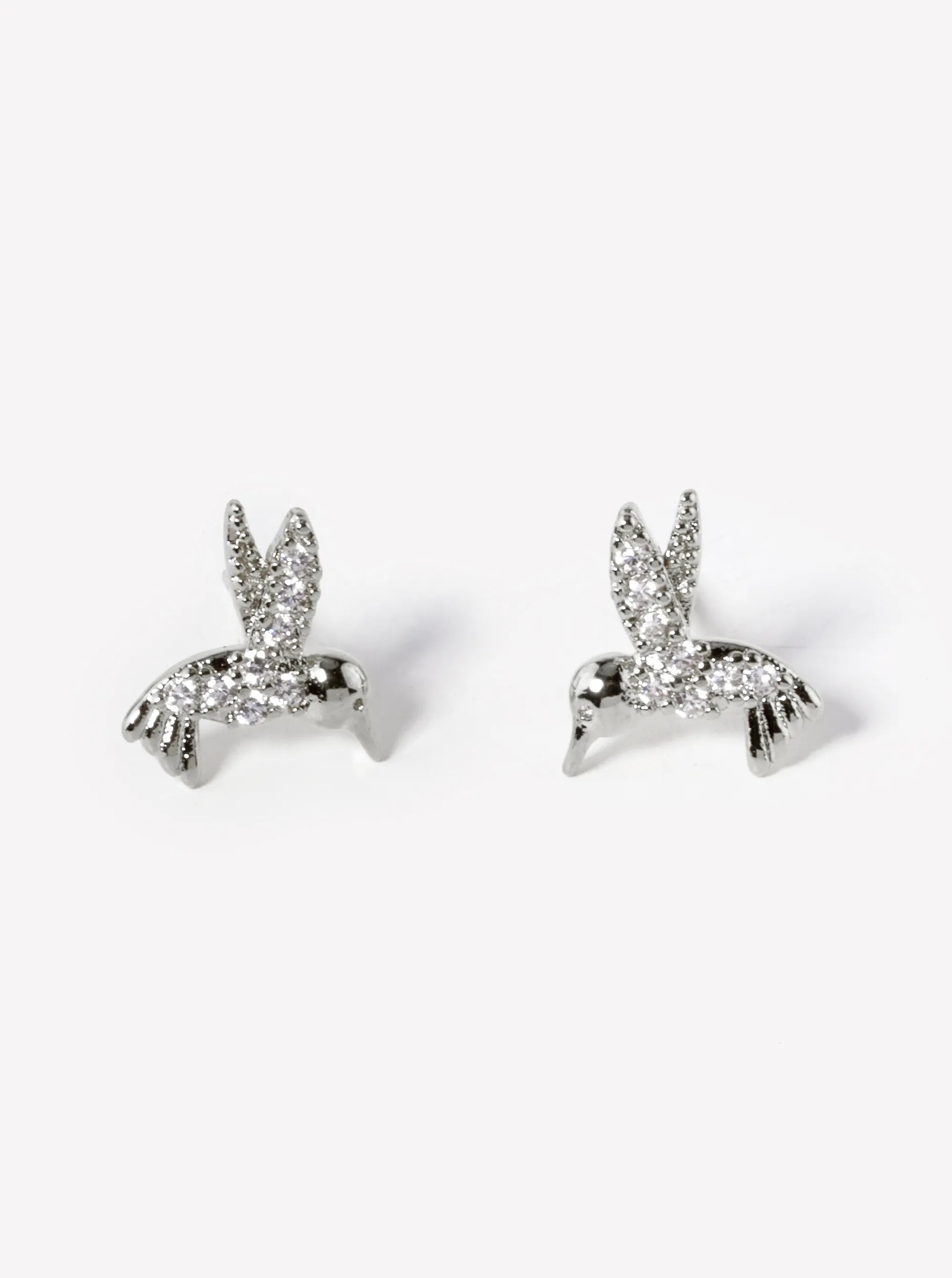 White Gold Dipped CZ Pave Kingfisher Bird Stud Earrings