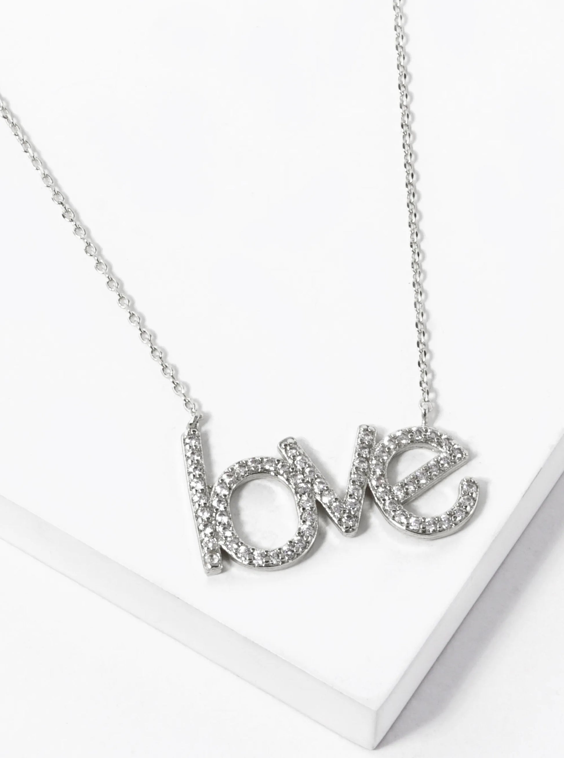 White Gold Dipped CZ Pave Love Word Pendant Necklace
