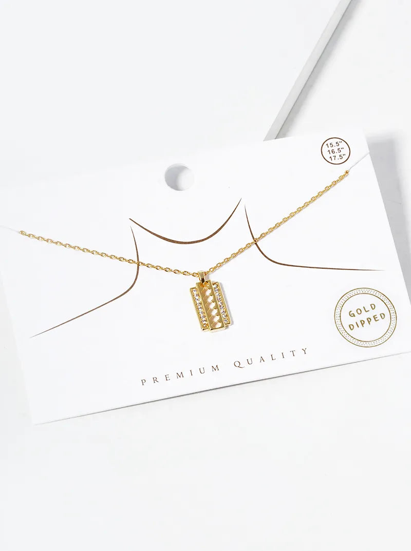 This 18k Gold Dipped CZ Pave Razor Pendant Necklace Will Sparkle And Shine No Matter The Season. This Pendant Will Be A Great Addition To Any Collection And Sure To Sell Quickly.