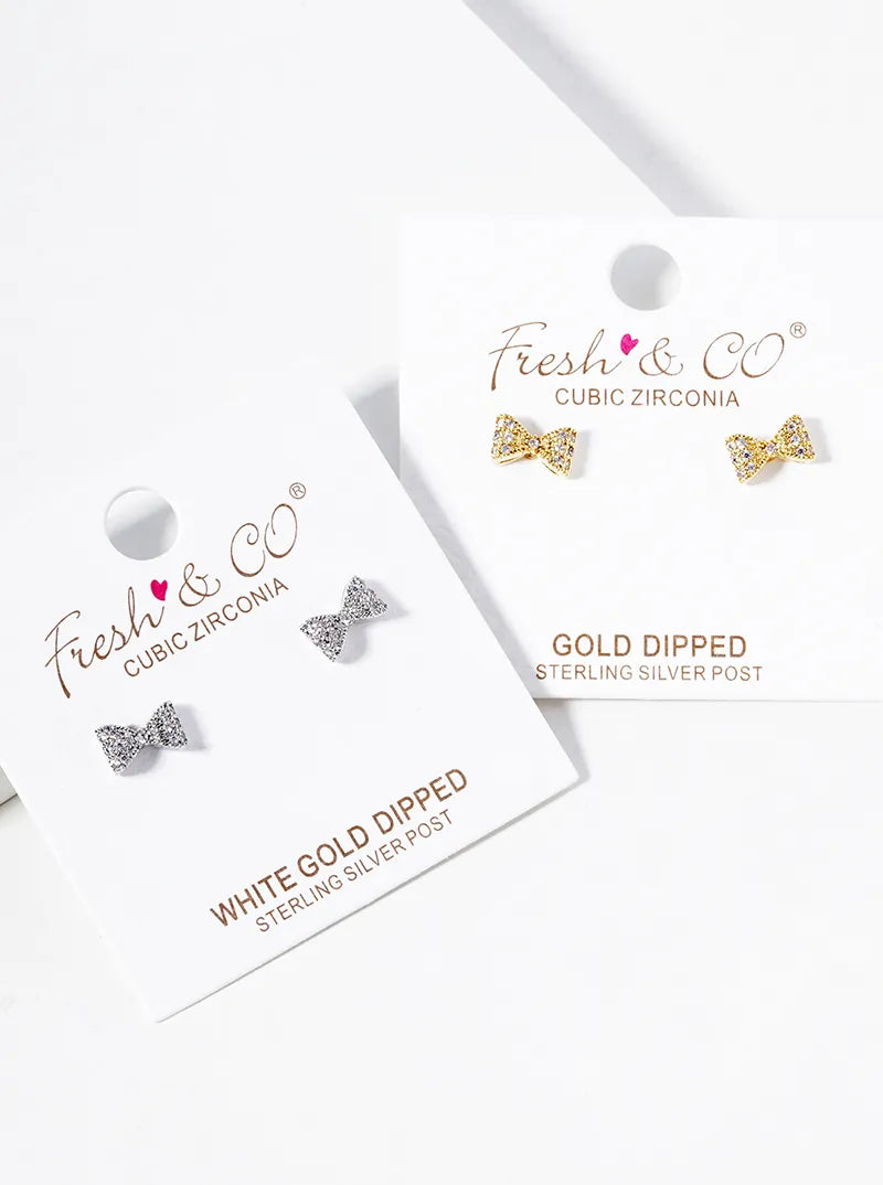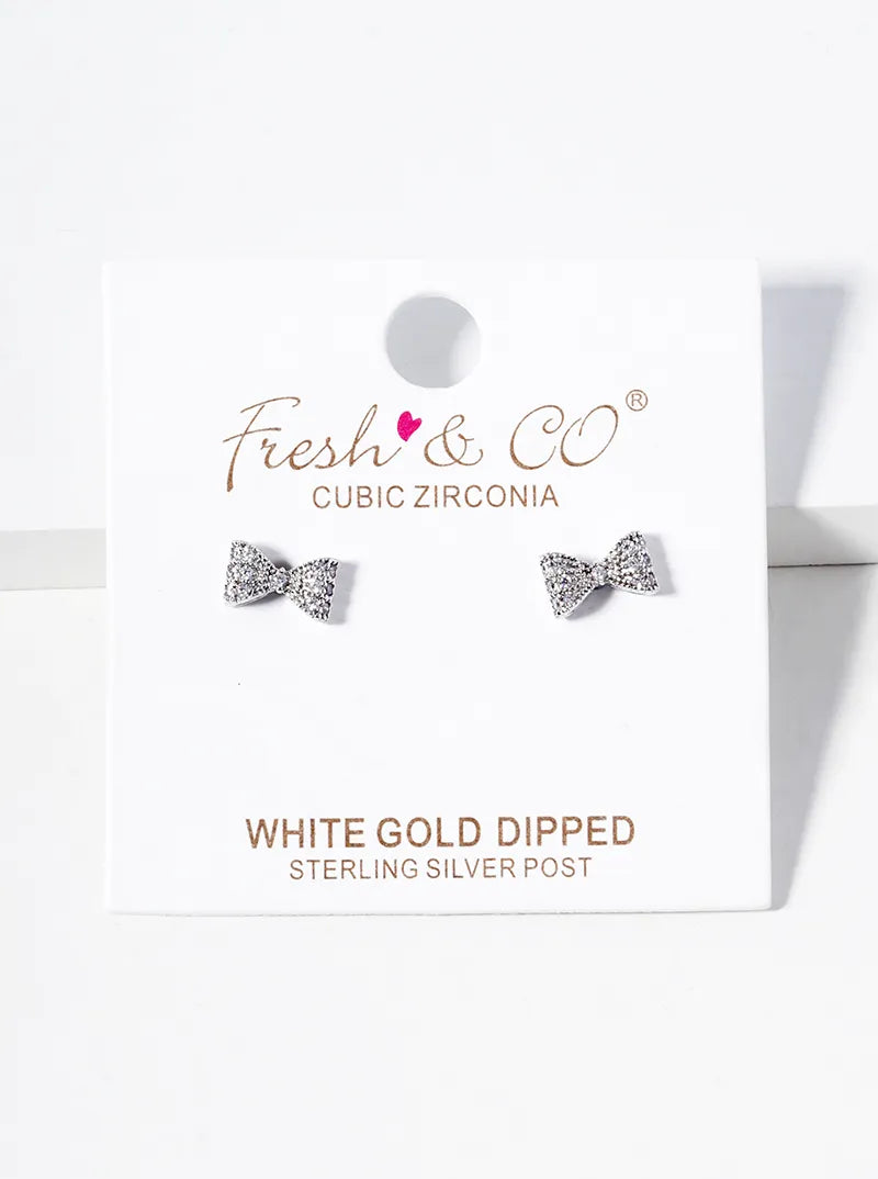 White Gold Dipped CZ Pave Ribbon Bow Post Stud Earrings