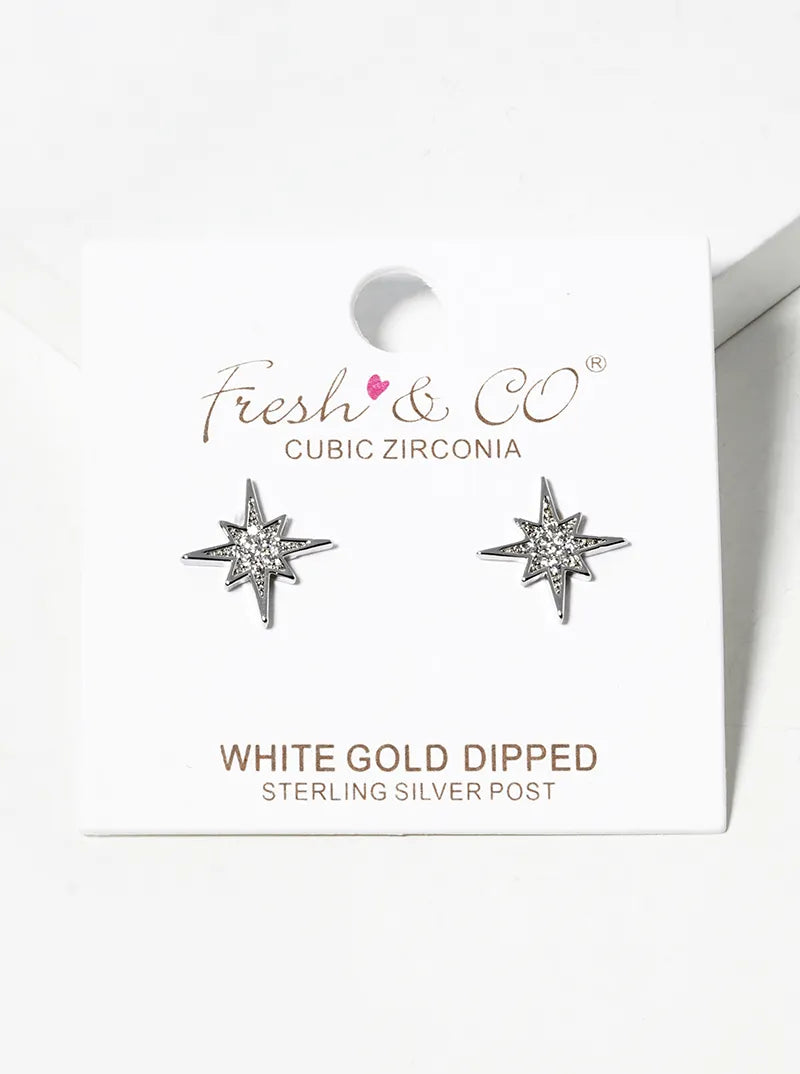 White Gold Dipped CZ Pave Starburst Post Stud Earrings