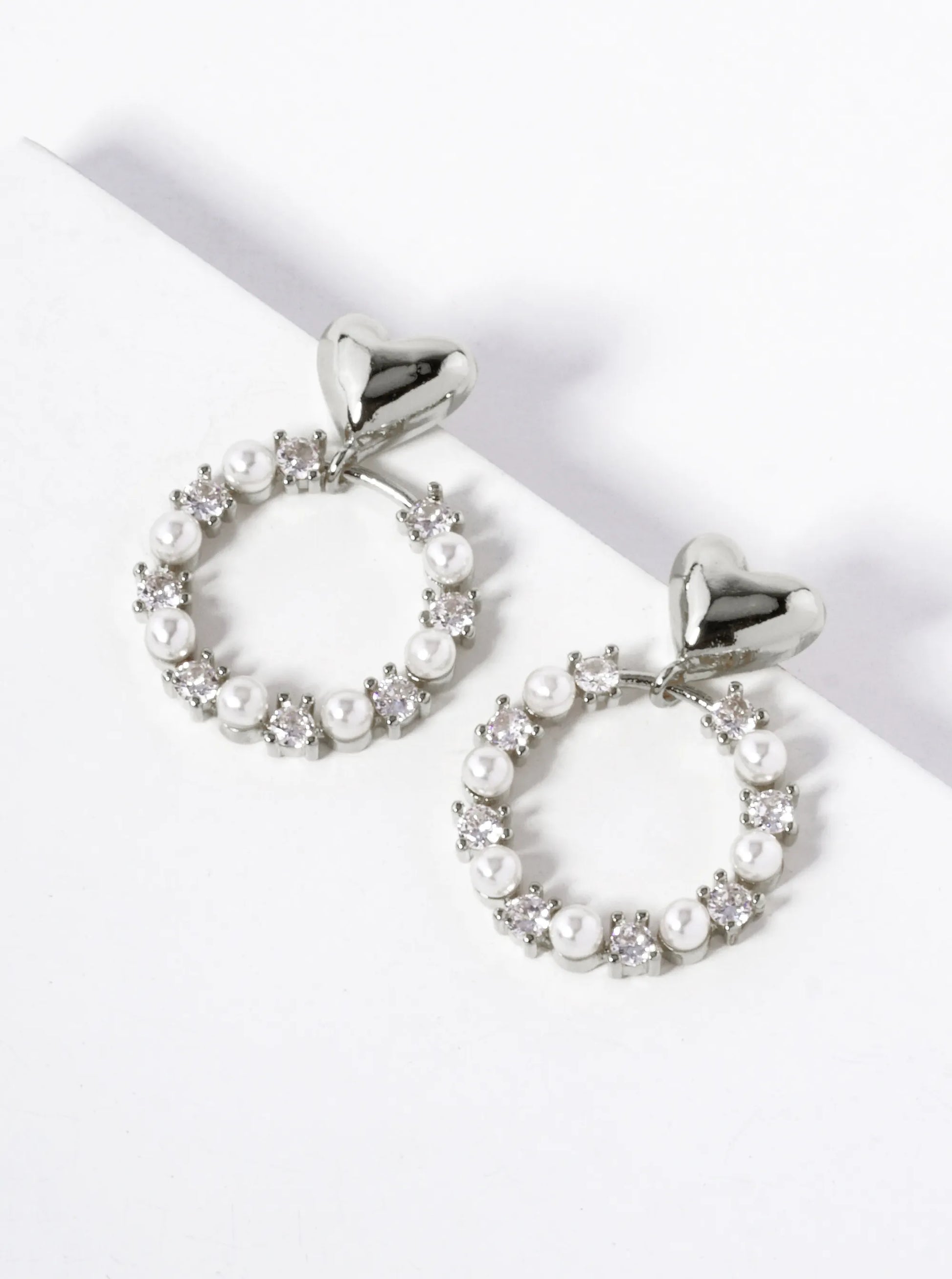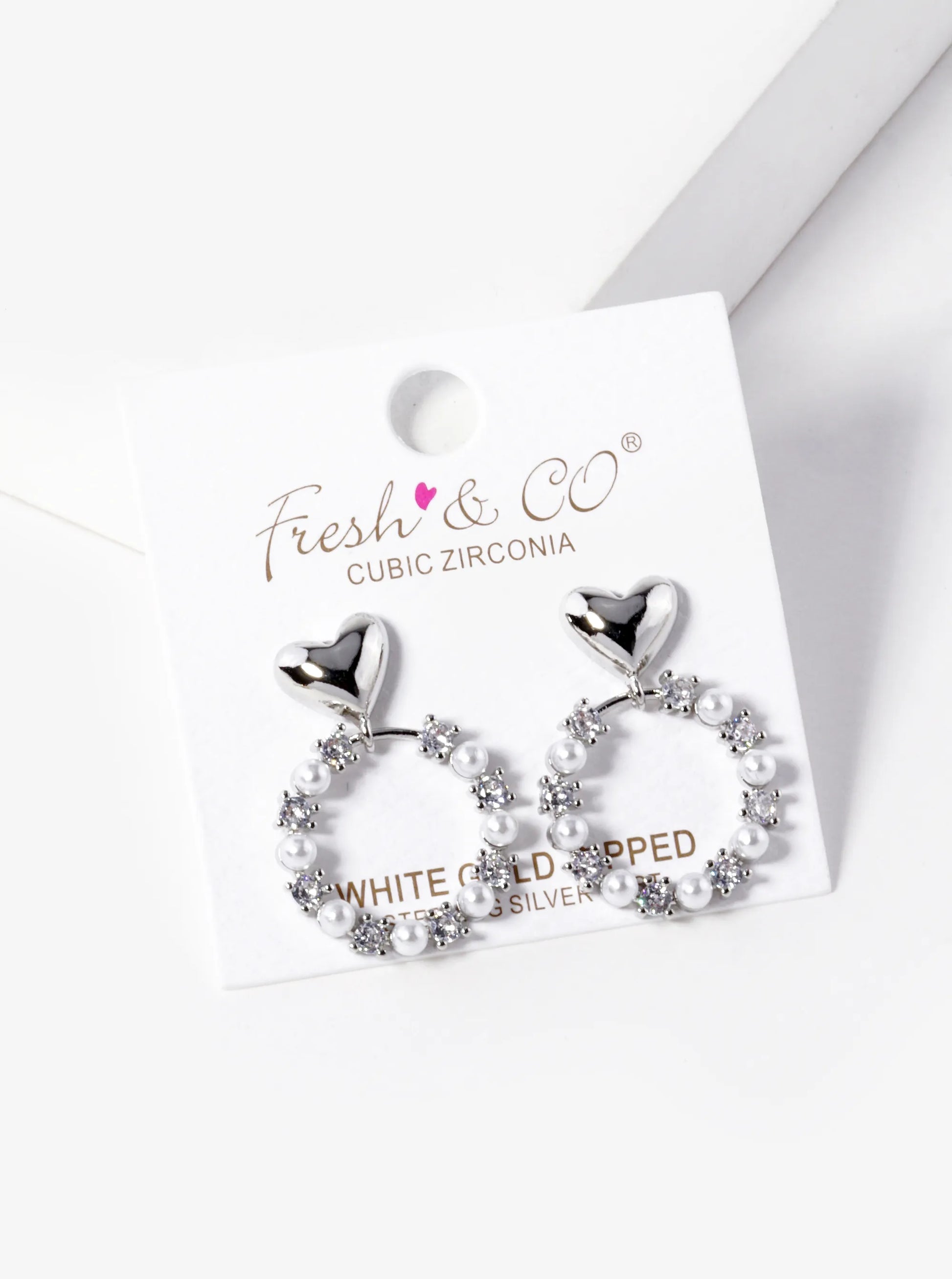 White Gold Dipped CZ Pearl Beaded Circle Drop Heart Dangle Earrings