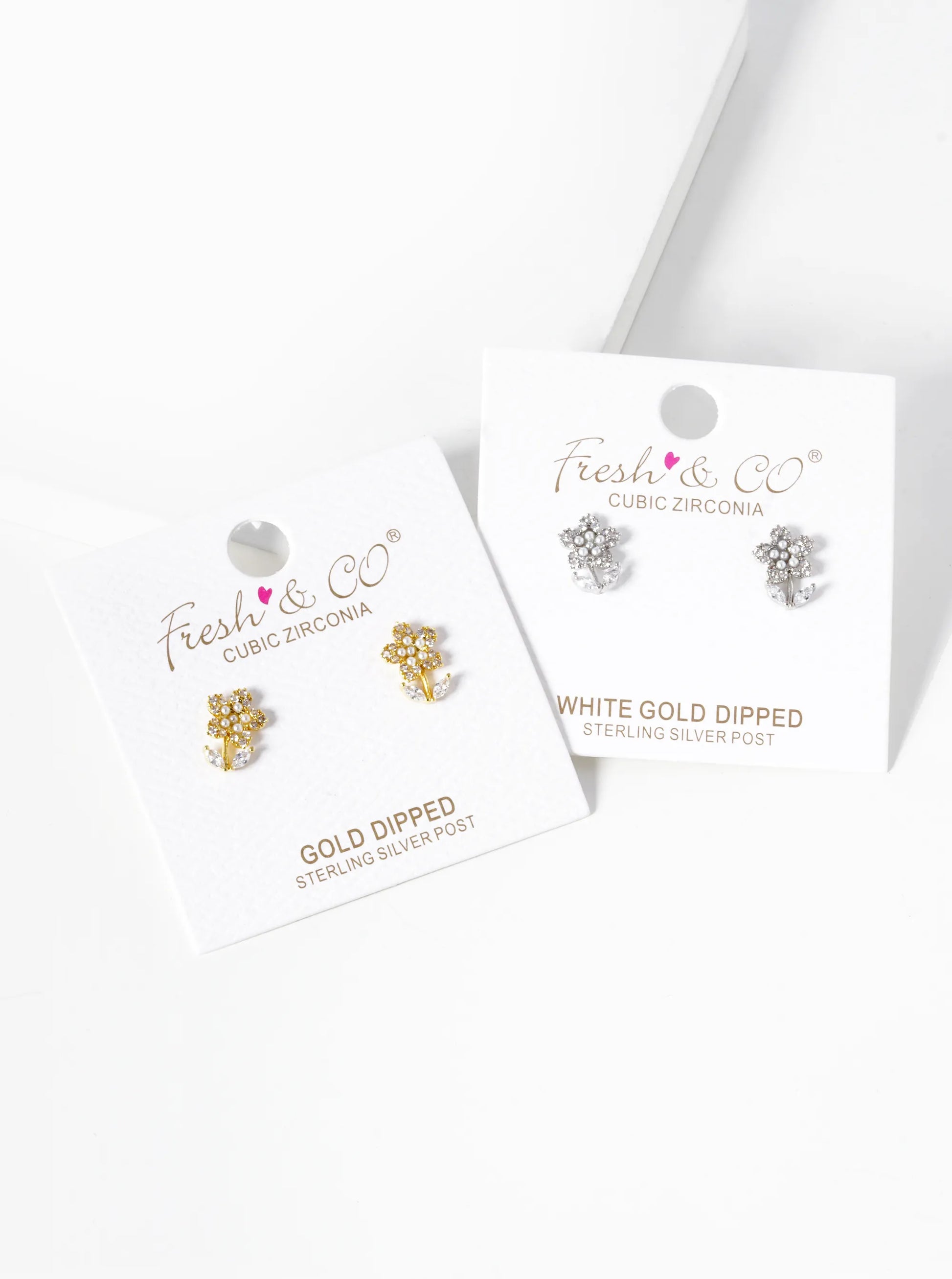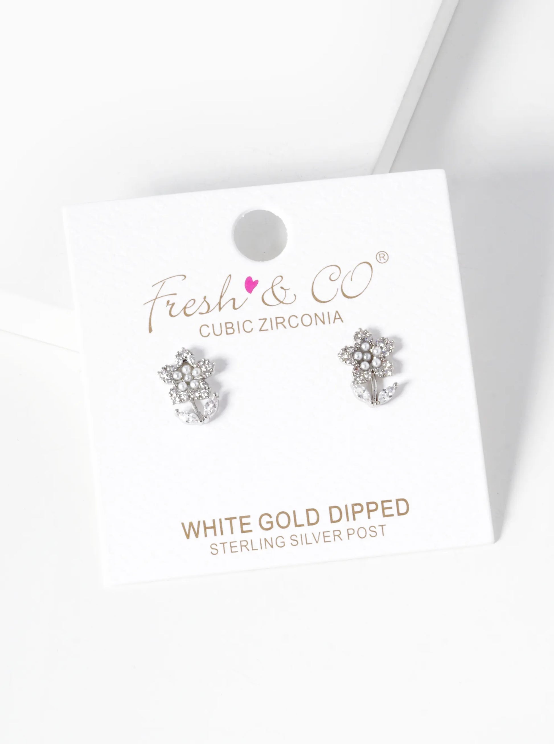 White Gold Dipped Pearl And CZ Pave Flower Stud Earrings