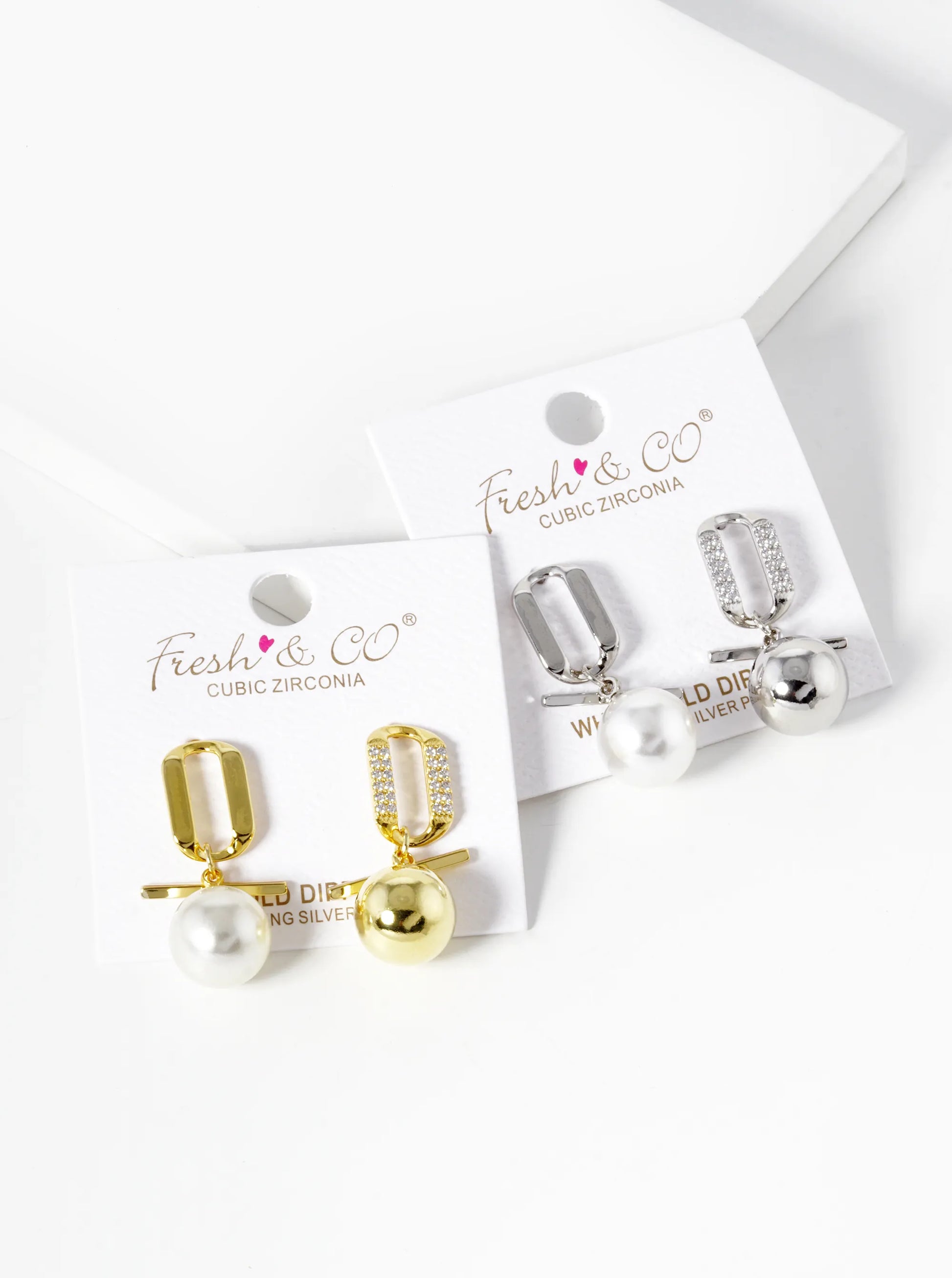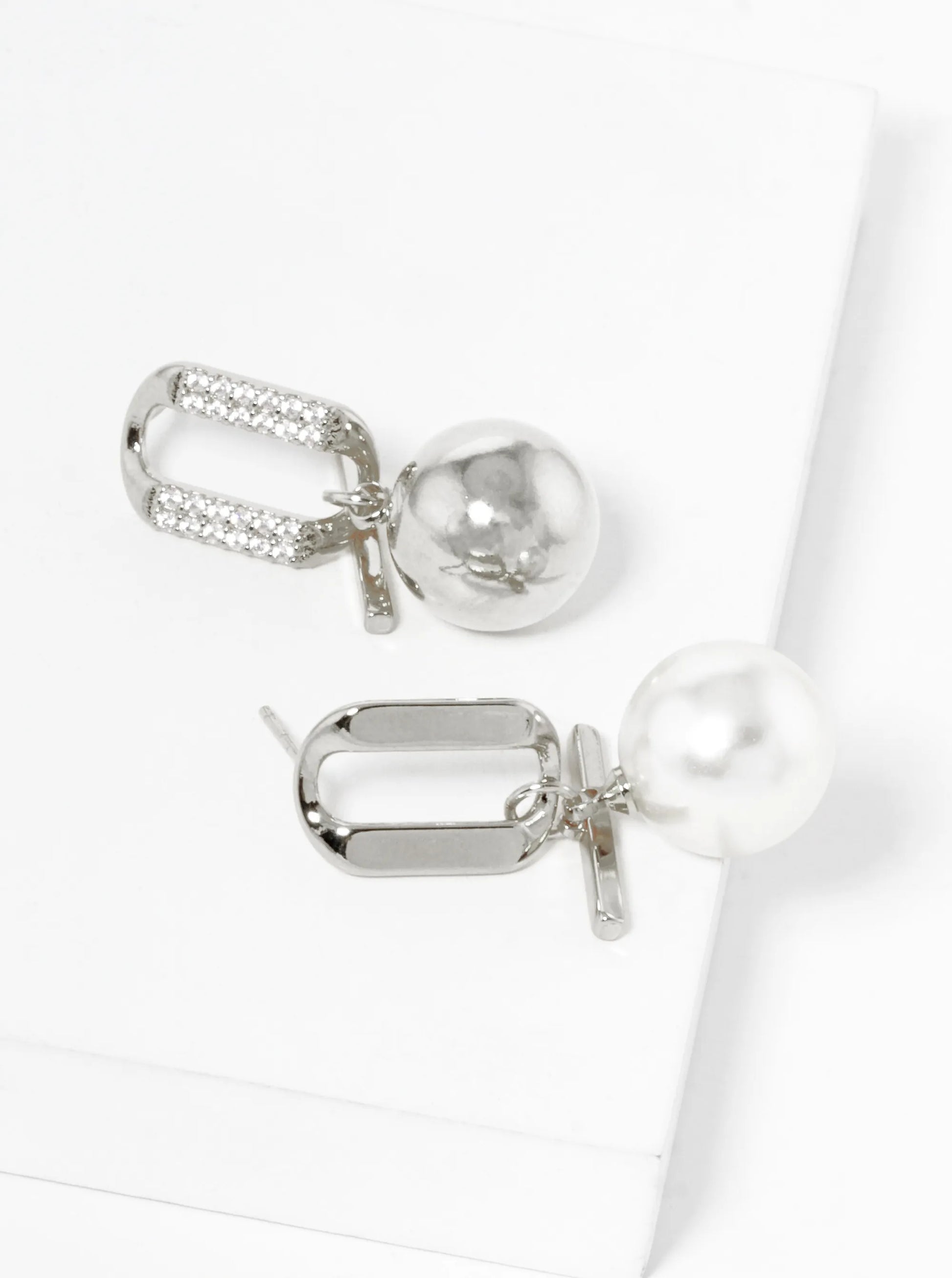 White Gold Dipped Pearl And Metal Ball Drop CZ Pave Uneven Dangle Earrings