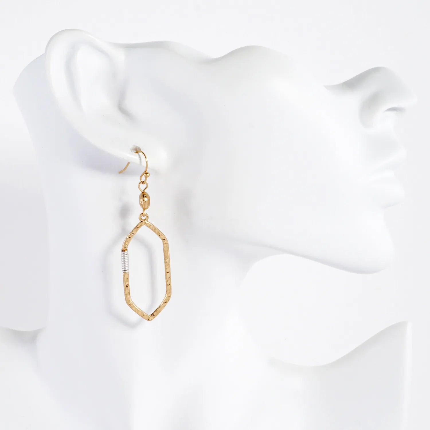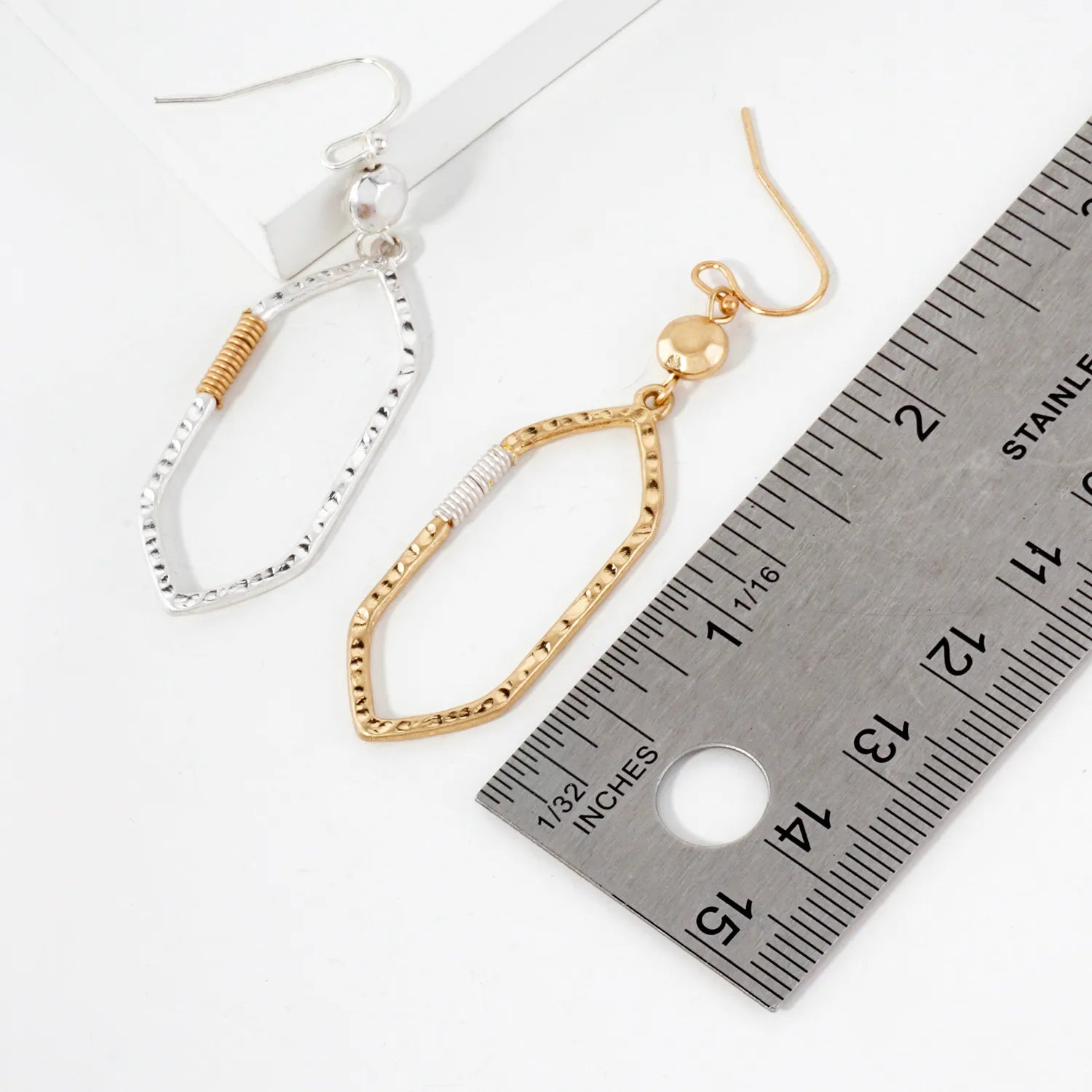 Artisan Detail Meets Modern Shape In These Wire-Wrapped Hammered-Texture Elongated Hexagon Drop Earrings. Featuring A Slim, Geometric Hexagon Silhouette With A Hand-hammered Finish, Each Earring Is Accented By A Delicate Wire-wrap Detail That Adds Depth And Handcrafted Charm. The Elongated Drop Design Flatters And Elongates The Face, Making Them A Striking Yet Wearable Piece.