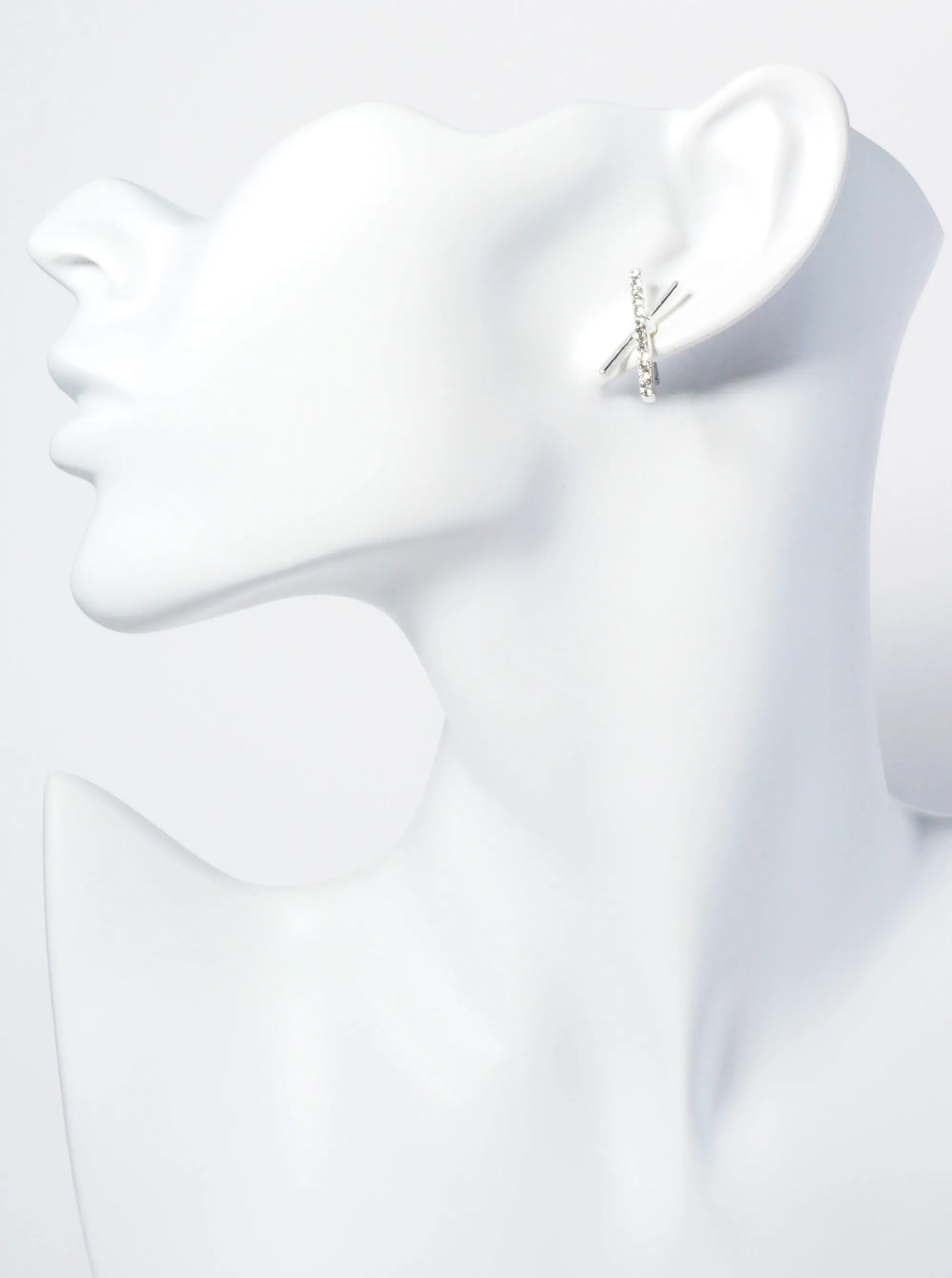 These Earrings Offer A Contemporary Twist On Classic Stud Earrings. These Earrings Feature A Distinctive X-shaped Design, With A Sleek, Geometric Structure That Stands Out. One Side Of The X Is Adorned With A Row Of Sparkling Stones, Creating A Striking Contrast Against The Clean Metal Of The Other Side.
